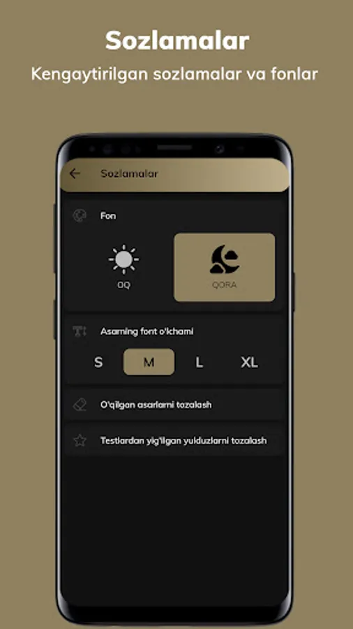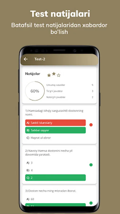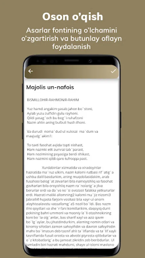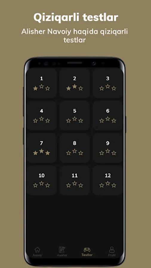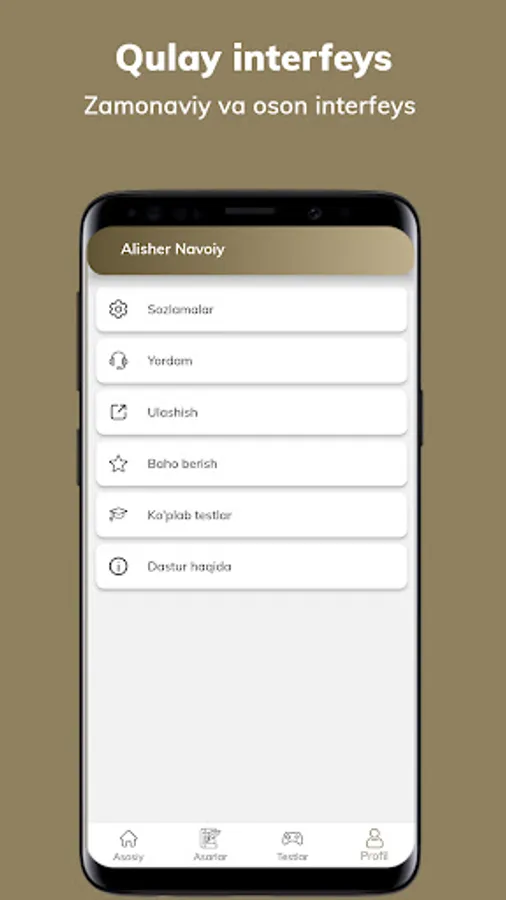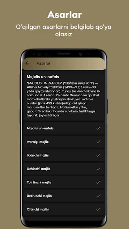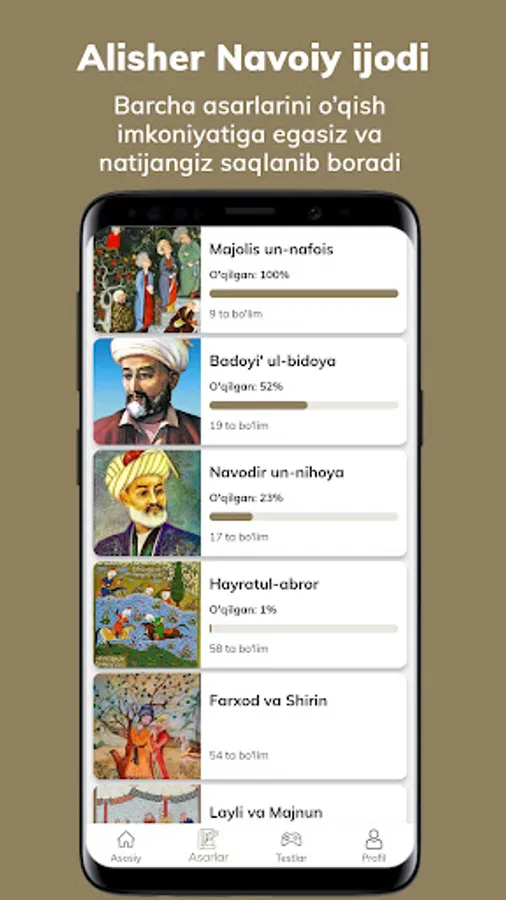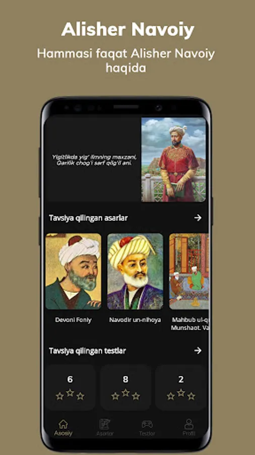 Siz ilovamizdan foydalanib Alisher Navoiy ijodi va u haqidagi testlarni ishlashingiz mumkin. Dasturda Alisher Navoiyning eng ommabop asarlari mavjud va o'qish uchun tayyor. Alisher Navoiy ijodi va hayoti haqida bosqichli qiziqarli testlarni yechishingiz mumkin va natijangiz uchun yulduzlar beriladi. O'zingizga xohlagan, sizning stilingizga mos keladigan fonlarni tanlashingiz va font o'lchamini o'zgartirish imkoniga egasiz. Yana, o'qilgan asarlarni belgilab qo'yish imkoni sizga qayerga kelib qolgan bo'lsangiz shu yerdan boshlab zavqlanishingizga yordam beradi.