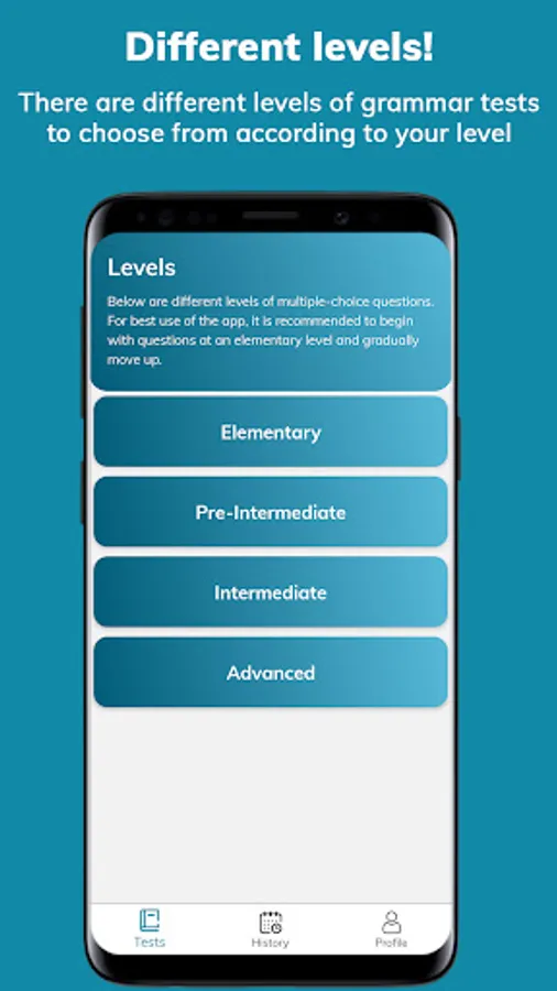 “English Grammar Tests” is the best application to learn English grammar. More than 10 000 premium quality English grammar multiple-choice questions are ready for you to solve in a fun way. The questions are properly sorted by their level so that you can solve questions according to your level. For best use of the app, it is recommended to begin with questions at an elementary level and gradually move up. You can achieve improvement in your English skills intensely using the “English Grammar Tests” application.