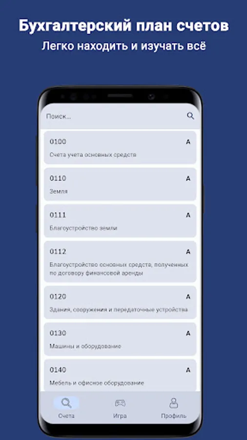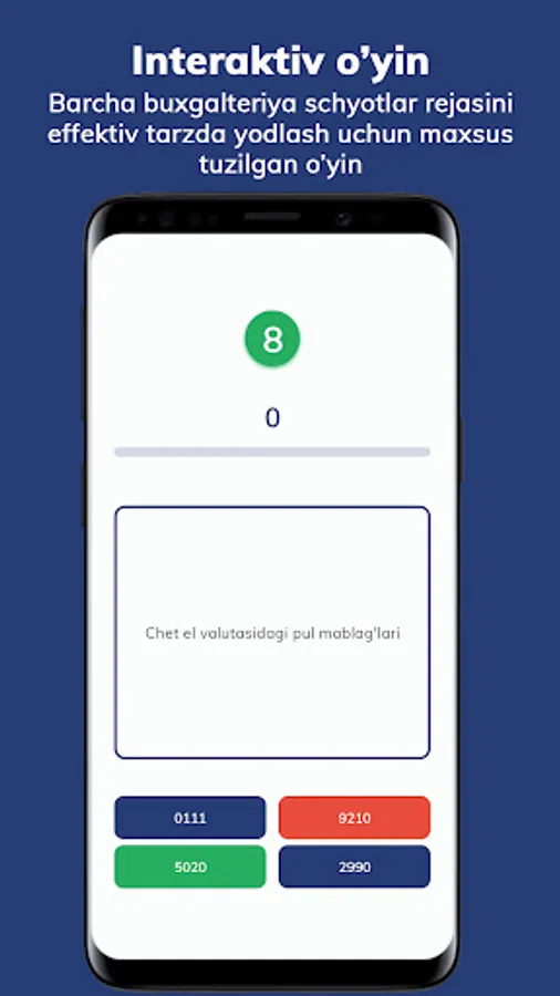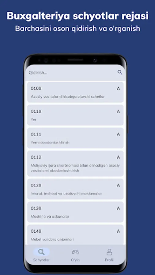 Dasturda siz barcha buxgalteriya schyotlar rejasini raqami, nomi yoki tavsifi orqali qidirib darhol kerakli ma'lumotlarni olishingiz mumkin. Bu esa sizni kitob varaqlab ma'lumotlarni qidirib topish uchun sarflanadigan vaqtni tejab sizga vaqtni yanada optimal ravishda ishlatishingizga yo'l ochib beradi. Bundan tashqari, dasturda buxgalteriya schyotlar rejasini effektiv, tez va oson ravishda yodlash uchun maxsus yaratilgan interaktiv o'yin sizga maqsadingizga erishishga yordam beradi. Darvoqea bu o'yin shunday qiziqarliki siz do'stingiz bilan raqobatlashib bilimingizni sinashingiz mumkin. O'yin o'ynab bilim oling!