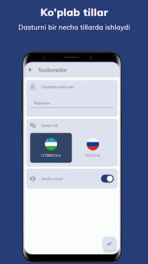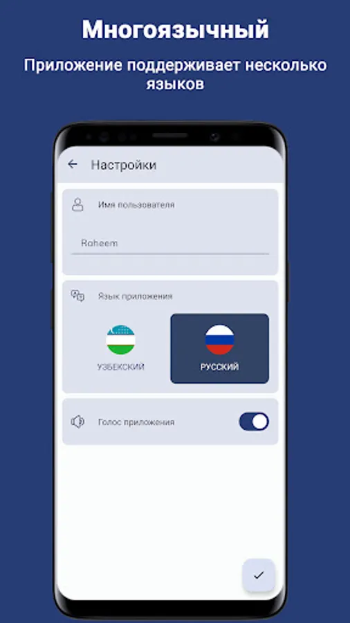 Пользоваться программой можно на двух языках (узбекском, русском). Приложение полностью работает без интернета. Это дает вам возможность пользоваться приложением в любом месте!
