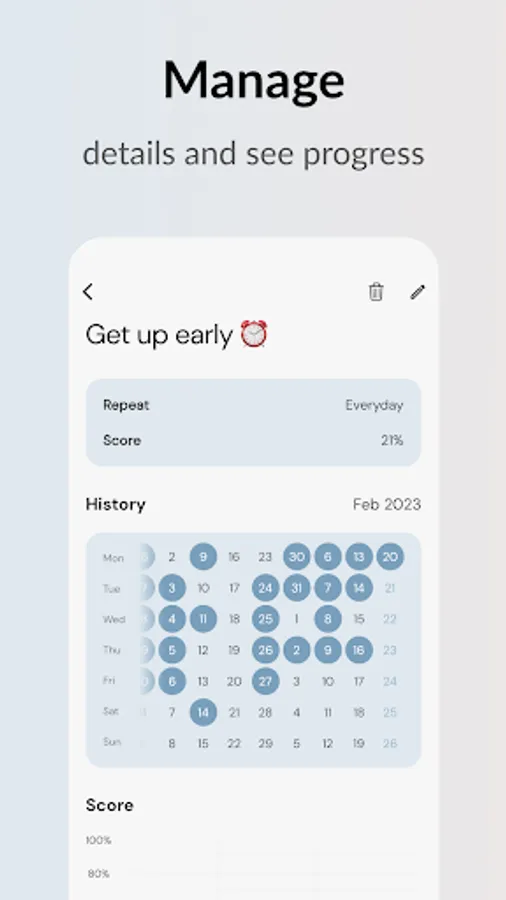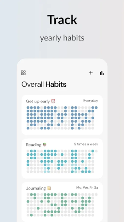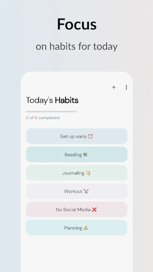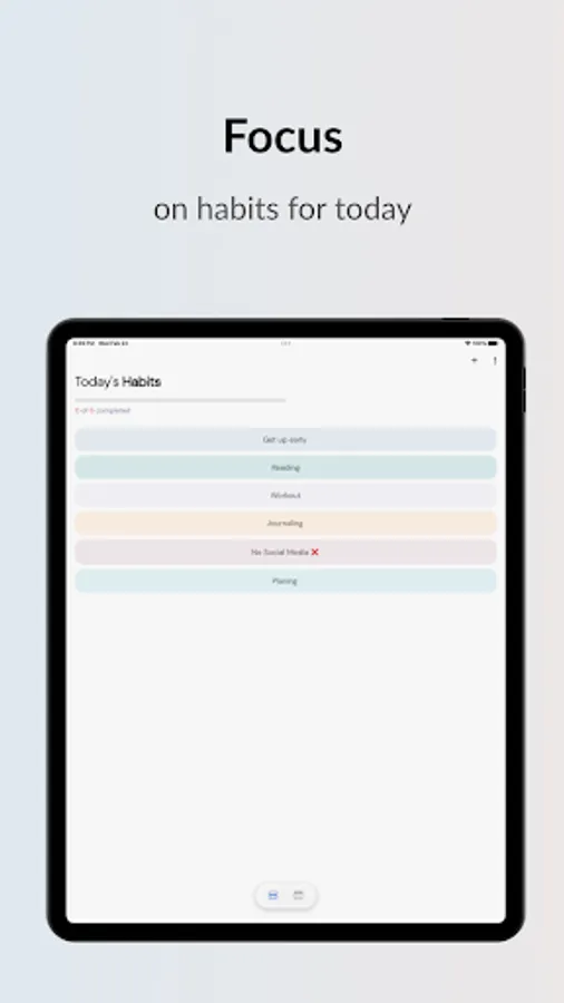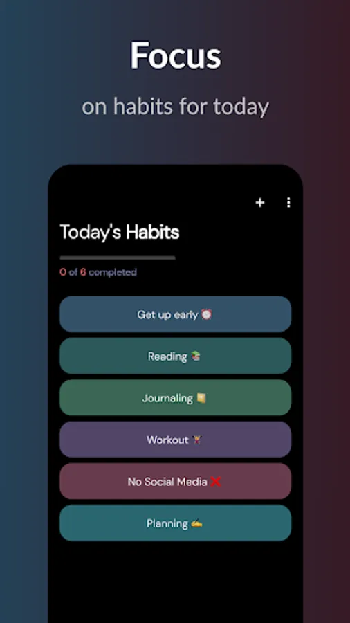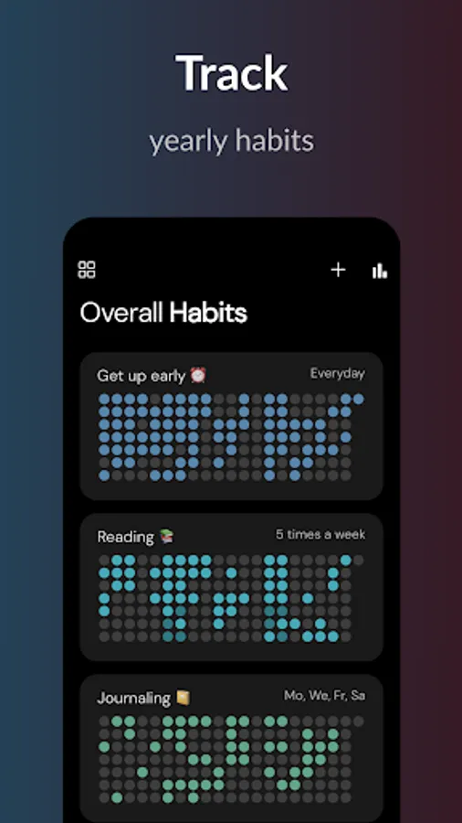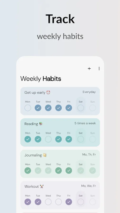 The app helps you easily track your habits. On the main screen, you see today's habits which allow focusing on what is important today. You also have the weekly view where you can see all the habits and their status for this week. The app allows seeing the history of your habits and their progress over time. The app is designed to be very simple. You swipe any habit to mark it as complete for today.