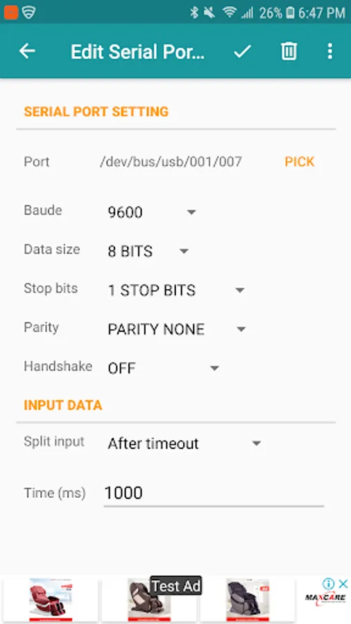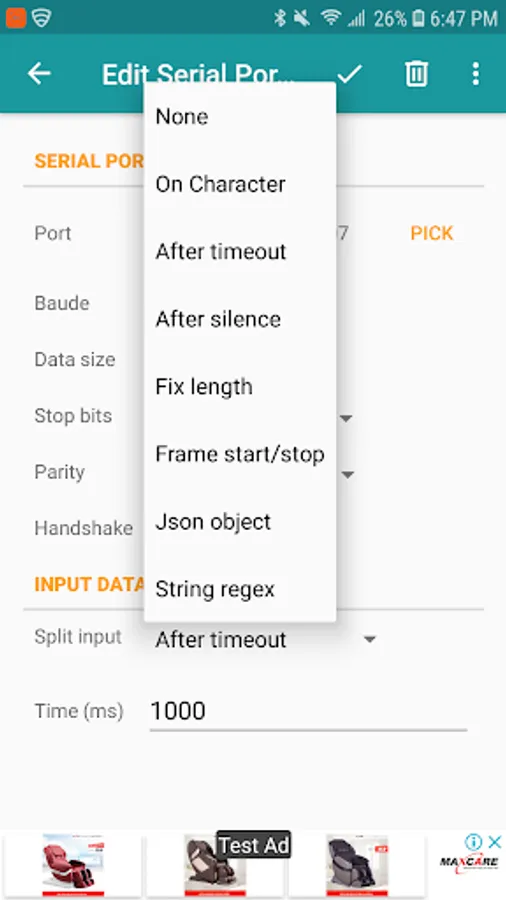 - On Character:"Split on" character is used to split the input into separate messages. It can also be added to every message sent out to the serial port.