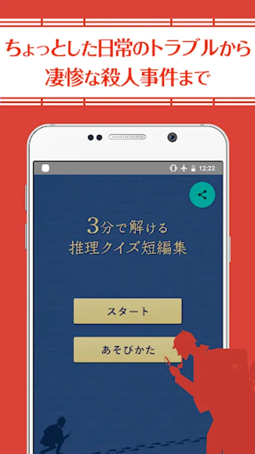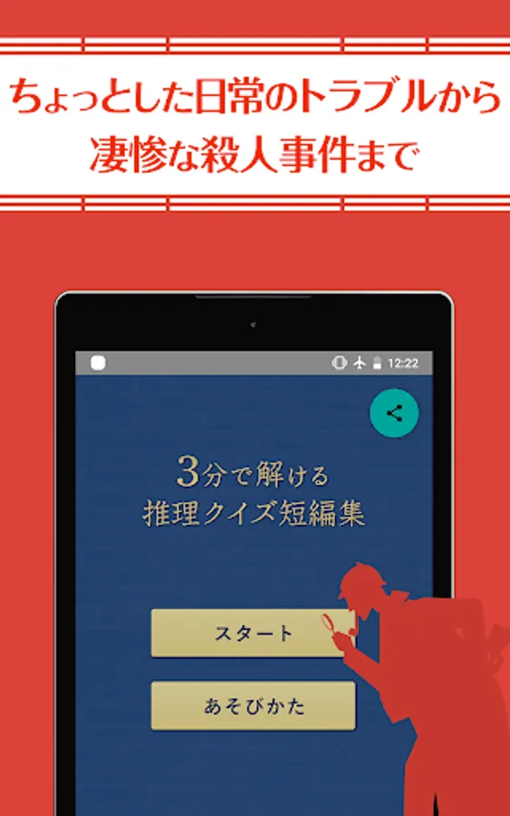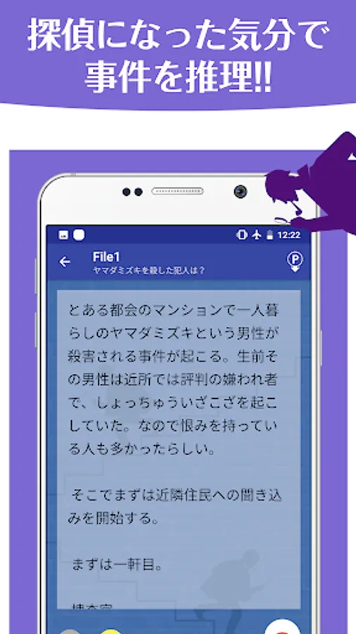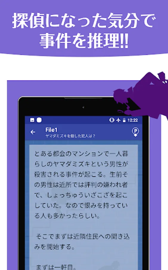 本アプリには、日常で起こるちょっとしたトラブルから陰惨な殺人事件まで、さまざまなミステリーが収録されています。