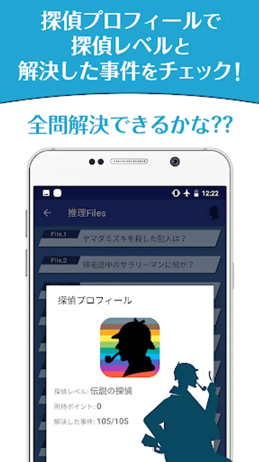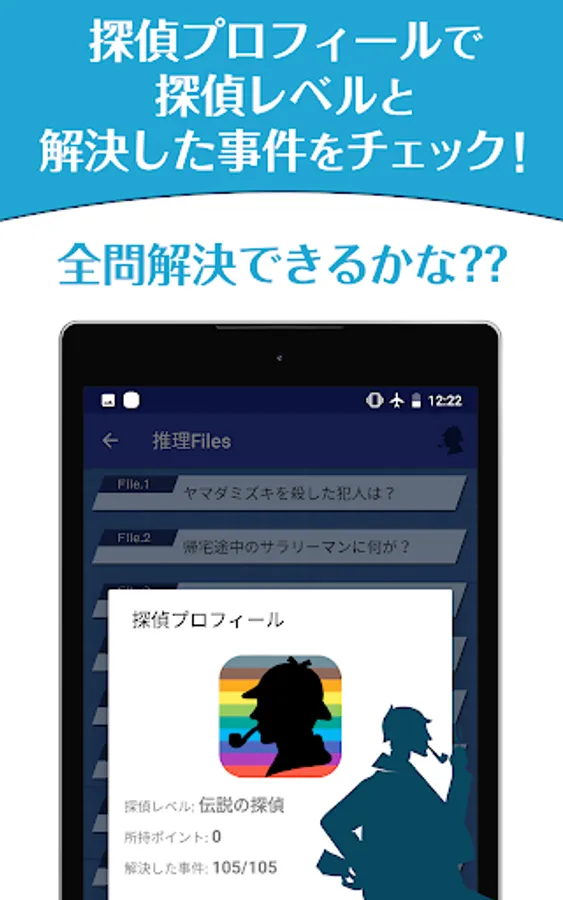 ・クリア数に応じてランキング(探偵レベル)を表示。伝説の探偵を目指そう!