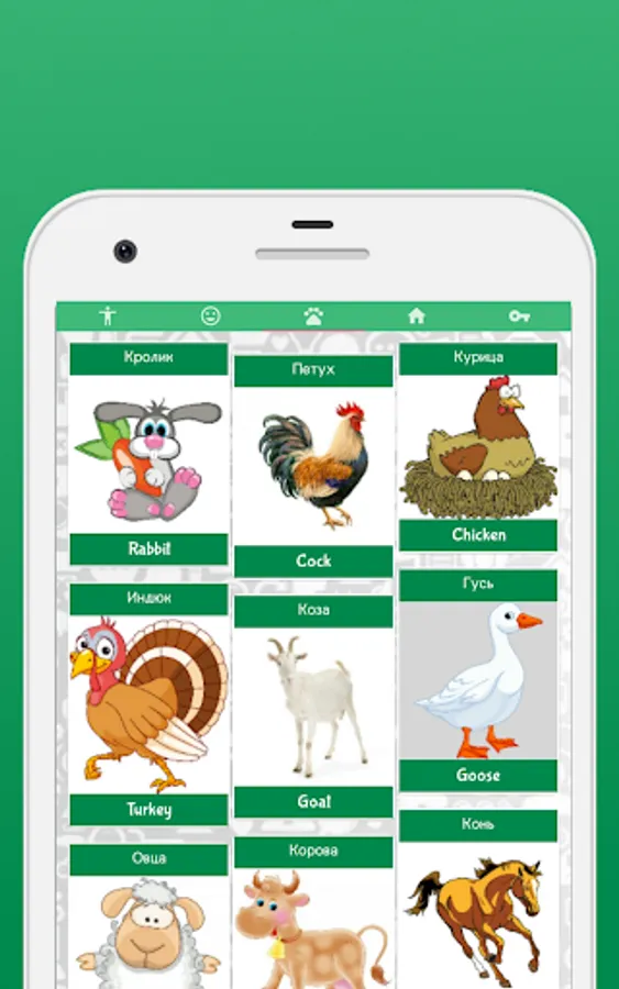 The card consists of a large image and the name in two languages. Thanks to the colorful photo illustrations, the baby is interesting to do, he formed the right idea of the world.