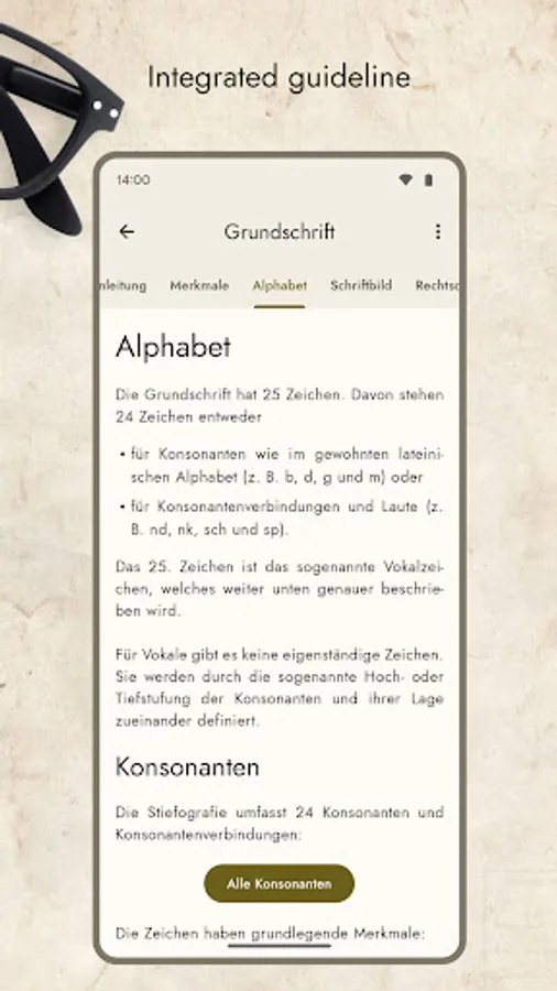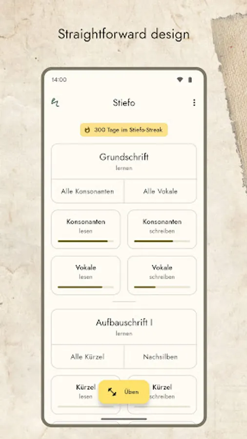 The goal of this app is to teach you the whole shorthand system step-by-step with effective exercises. For this purpose, it is divided into the successive levels "Grundschrift", "Aufbauschrift I" and "Aufbauschrift II".