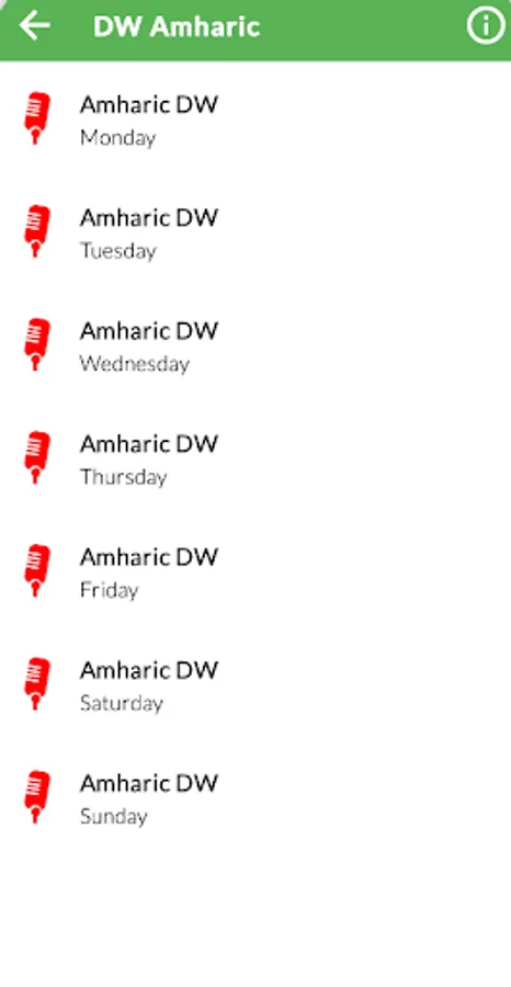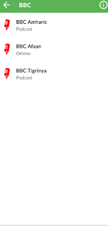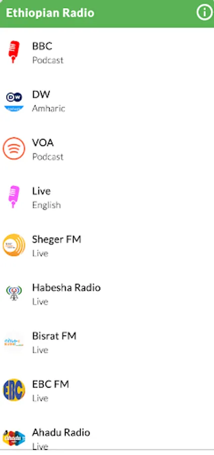 Stations include, BBC, VOA, DW, Ethio FM, Sheger FM, Bisrat FM, Habesha Radio, Ethiopian Music, DW Amharic, Tsega FM, Afaan Oromo, Amharic & Tigrinya.