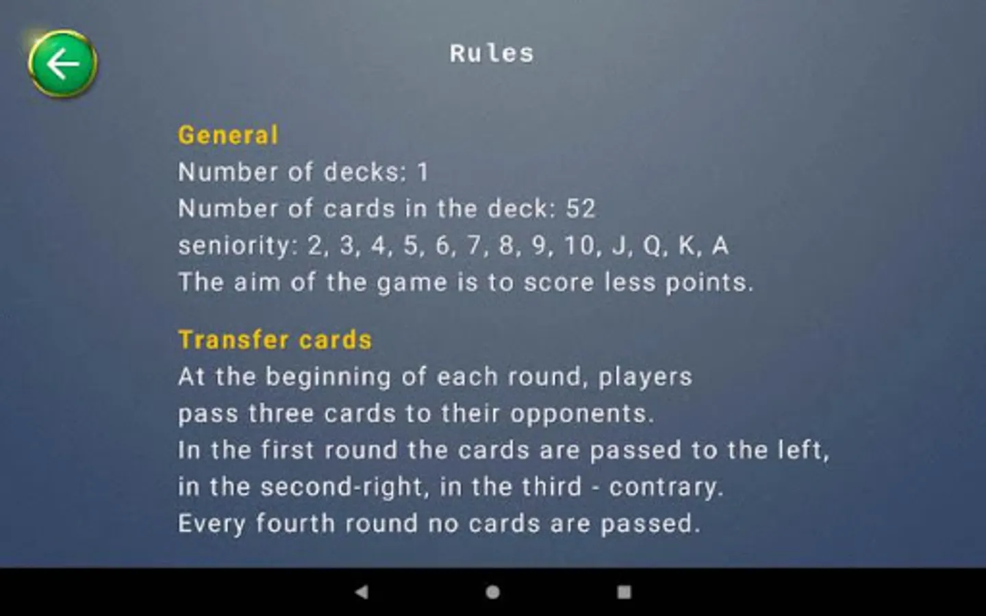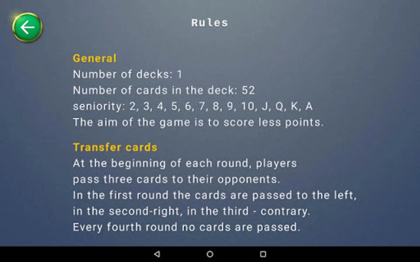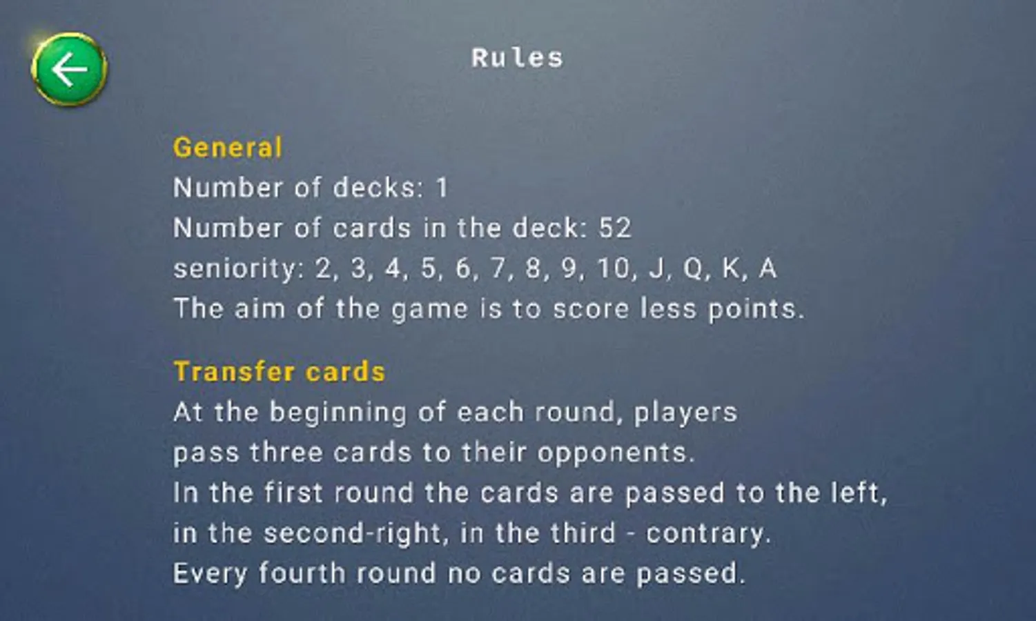 The goal of the card game "Hearts "is to score the lowest score on the results, avoiding unwanted cards of the suit of hearts, which are rated at 1 point and the" queen of spades " at 13 points.