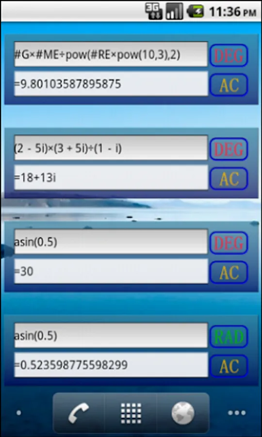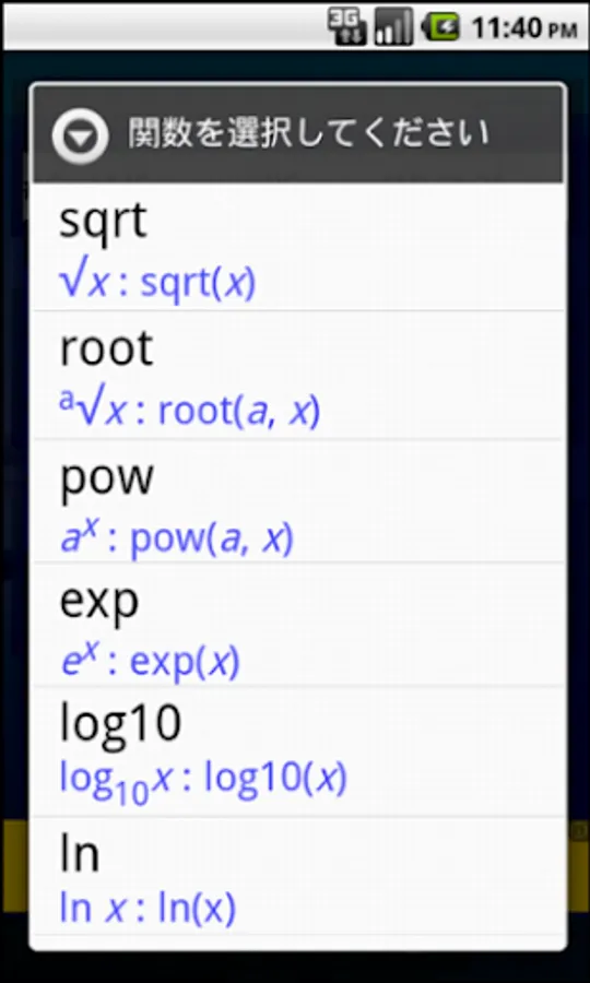 ・ Functions such as trigonometric function, inverse trigonometric function, exponential calculation, logarithmic calculation, absolute value, complex declination, angle and arc change can be used.