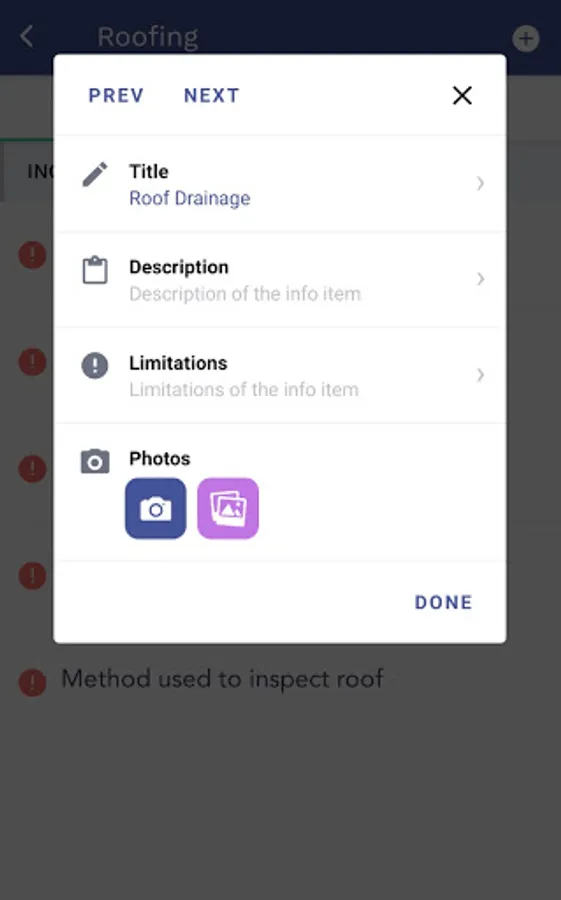 When you create a new report, common informational items such as exterior image or roofing material, with options, are added for you. If an option is missing, you can quickly add it yourself to only this or all future reports.