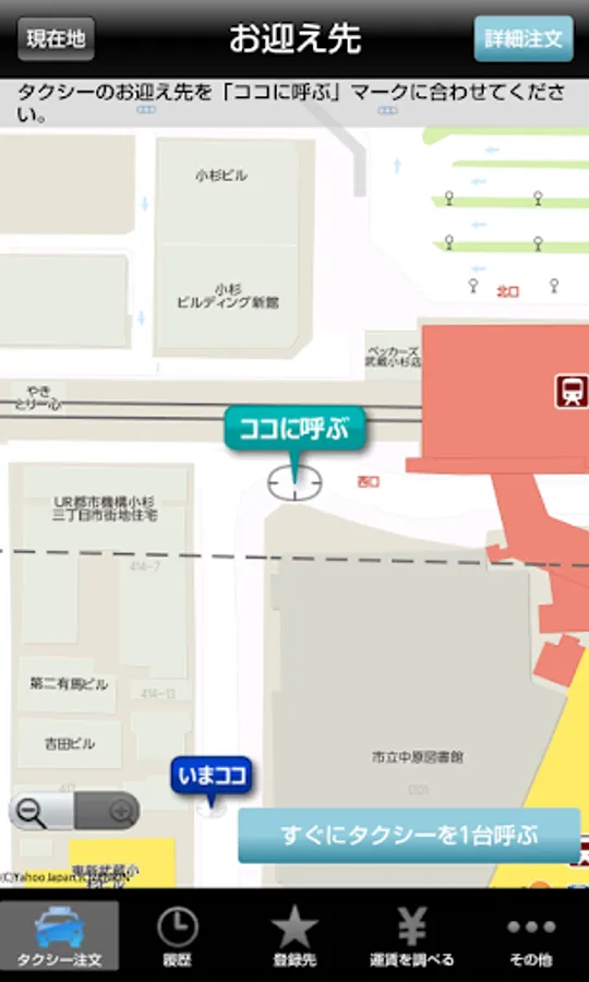 2. From [Taxi order], click the [Enlarge and specify location] button, and align the [Call here] mark with the taxi pickup location.