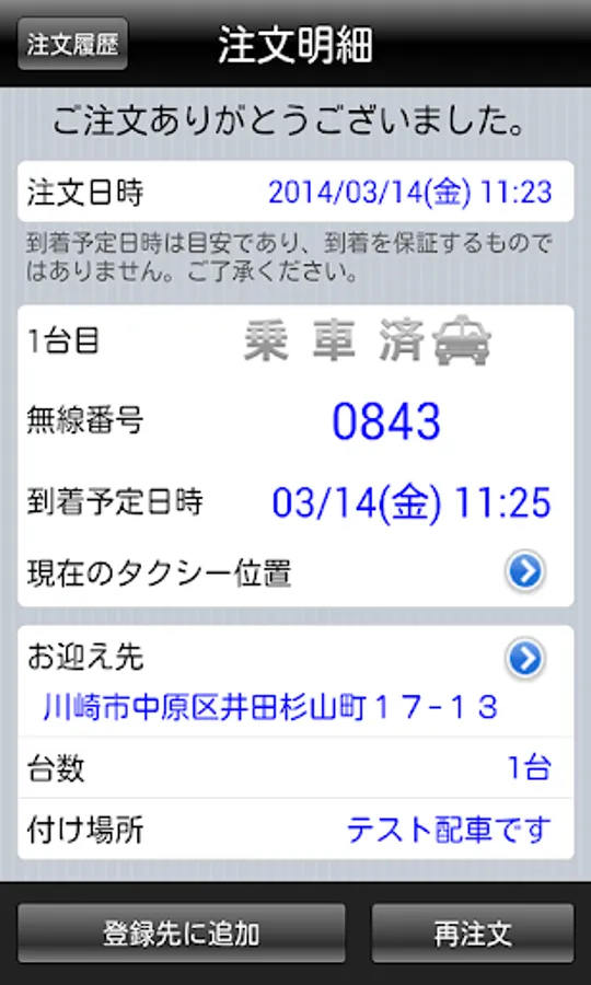 5. When the taxi arrangement is completed, we will inform you of the radio number of the taxi and the estimated arrival date and time. The order is now complete.