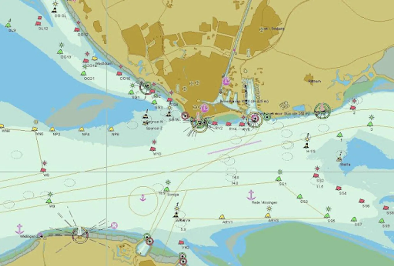 The charts contain all information for the sailor to navigate safely. They contain the actual buoyage and the most recent soundigs.