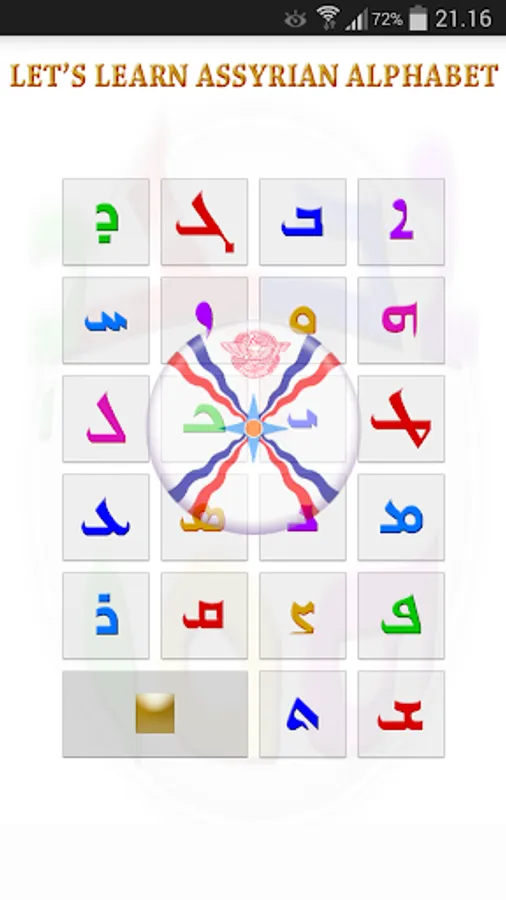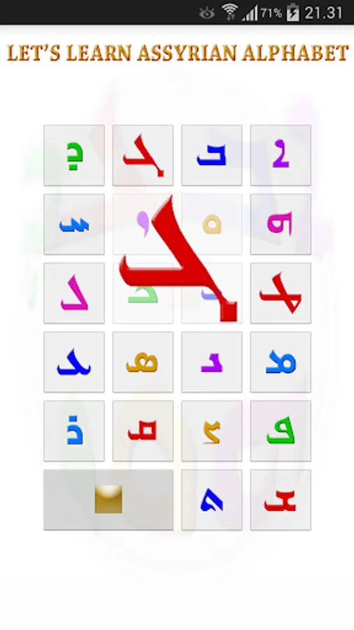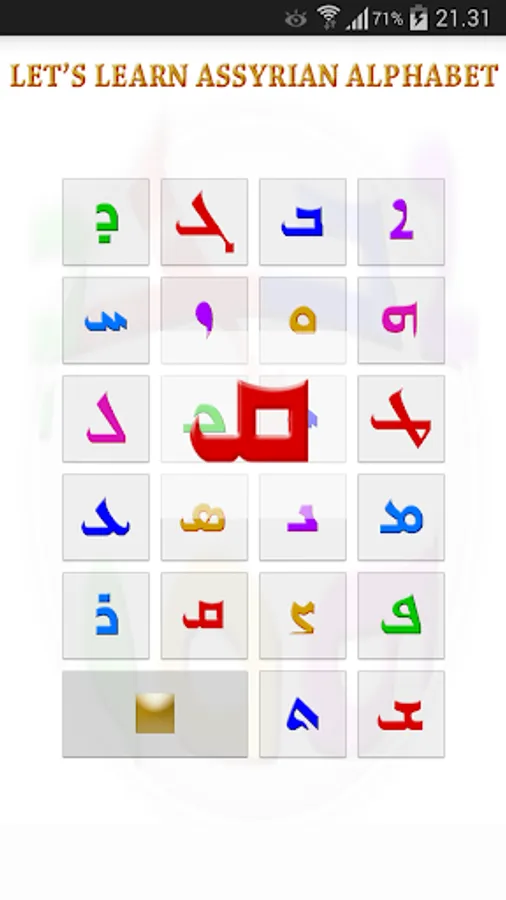 By tapping "Assyrian Alphabet Hunter" you and your kids are challenged by the disordred letters to hunt the letters throw the game. You ll get 50 points each time you tap on the right letter.