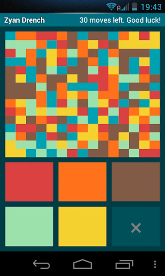 Game board is a random picture of size 15x15. Start from the top-left corner of the board. Select a new color for the top-left pixel, and all adjacent pixels of the same color will be painted over with the new color. The goal is to drench the whole board with your own color.