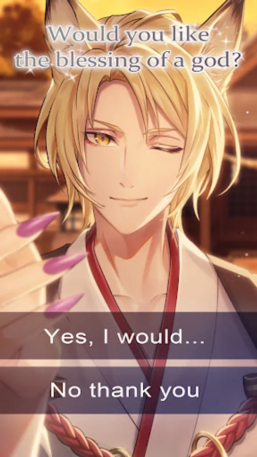 The next morning, he wakes up to find strange protrusions growing from his head... When he looks in the mirror, he realizes they are cat ears! He's speechless, but before he has time to figure out what's going on, the doorbell rings. He quickly puts a hat on to hide the ears and answers the door to find a man standing. He says that his name is Rihito and that our protagonist has been cursed! When asked about why he was cursed, Rihito explains that it's because of the shrine that he prayed to yesterday. The god of the shrine is a mischievous fox spirit known as Kitsunegami who rarely shows himself, but it seems he decided to play a trick on the protagonist for fun. When he asks how he can break the curse, Rihito tells him that there are two things he must do. First, he must enter a contract with Rihito. Second, he must find Kitsunegami. Kitsunegami can give him a seal, but to receive the seal, one must have magical powers. That is where the contract with Rihito comes into play. It all seems a little fishy, but without any other choice, he takes Rihito's offer.