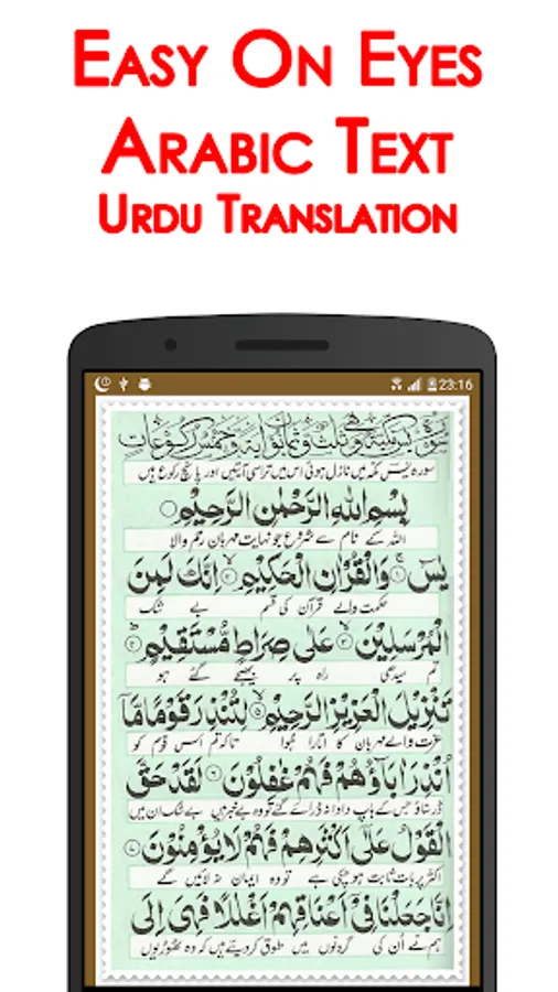 This Surat Ya Sin is a gift for everyone who wants to read Sura e Yaseen like they do on regular paper version of Holy Quran. It is easy on eyes and is with Urdu translation.