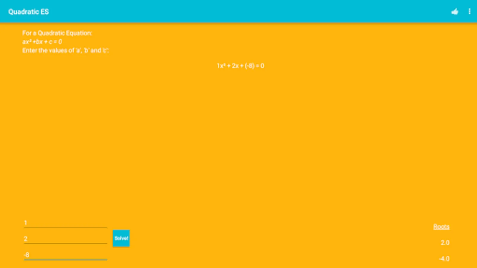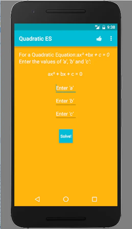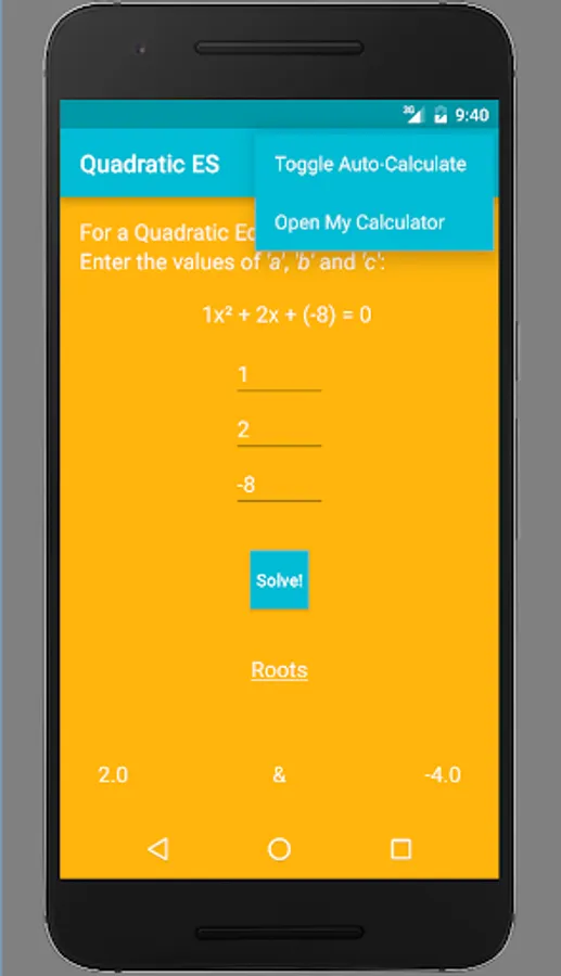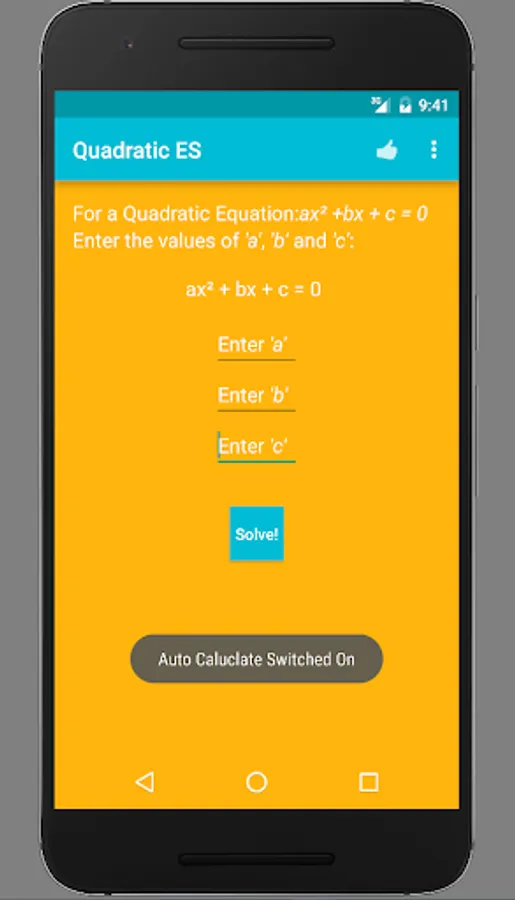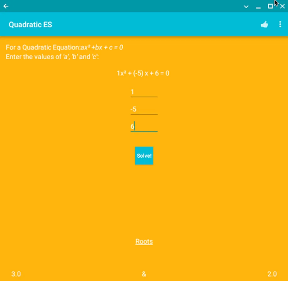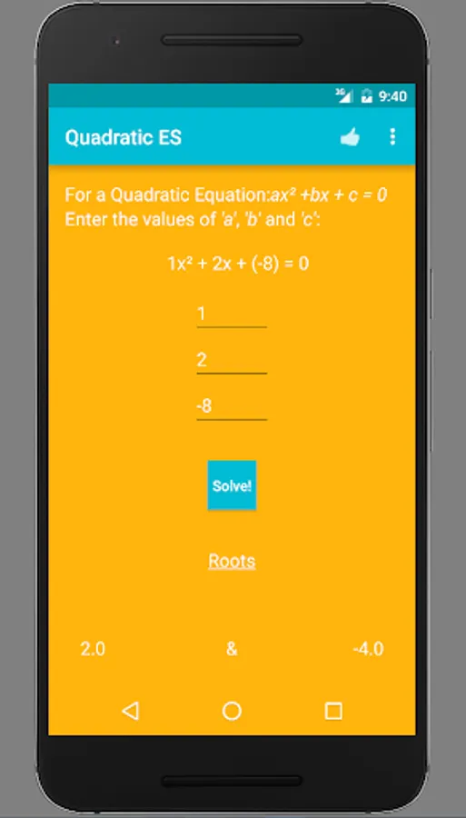 Are you finding a way to cross check your Quadratic Equation roots? Or are having a tough time doing the complicated math? Look no further! Quadratic ES (Equation Solver) is the right app for you. It's fast, accurate and beautiful. Find out the roots of any Quadratic Equation just by entering the respective co-efficients. Supports Android 4.0.3 and up. Optimized for Android Marshmallow.