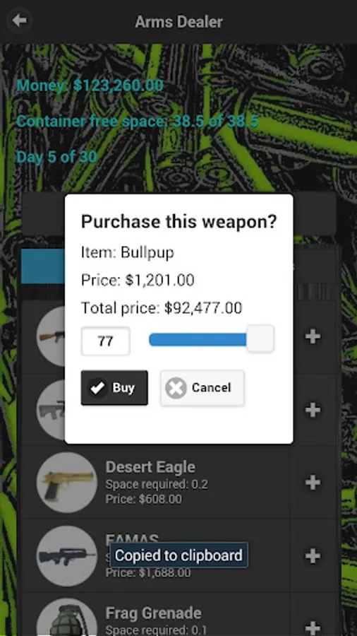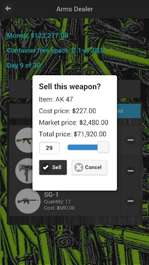 Do you have what it takes to be the worlds best Arms Dealer? The object of the game is to make as much money as possible in 30 days from buying and selling weapons on the market.
