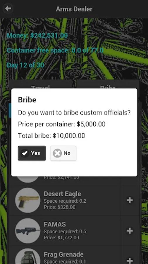 Each city will have weapons available at the market. The market may not have all weapons available. You can only sell a weapon if it's available at that market. Each city you visit will take 1 days travel. Before traveling to a city, you can bribe ($5000 per container) customs to not inspect your container. Random inspections will be held and if your weapon cache is discovered, it will be seized and destroyed.