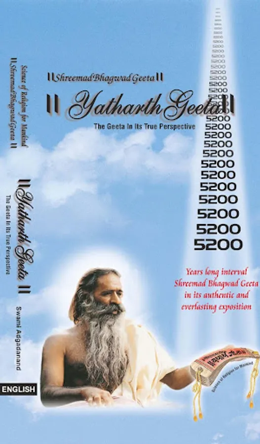 The Author of the Yatharth Geeta, Swami Adgadanand Ji Maharaj is a saint who is bereft of worldly education, yet is internally organised by the grace of accomplished Guru, which become possible after a long practice of meditation. He considers writing as an obstacle on the path to the Supreme Beatitude, yet his directions become the cause for this treatise. The Supreme Being had revealed to him that all his inherent mental attitudes have been nullified excepting a minor one writing of "Yatharth Geeta" Initially he had tried his best to cut this attitude too, through meditation, but the directive prevailed. Thus the treatise, "Yatharth Geeta" become possible. Where ever mistakes crept into the treatise, the Supreme Being himself rectified them. We bring forth this book with the wish that the Swamiji's motto "the internalized archive peace" would become "peace for everyone at the end".
