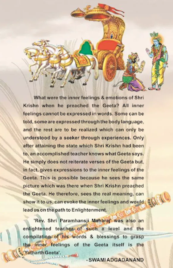 Rev. Shri Paramhansji Mahraj was also an enlightened teacher of such a level and the compilation of his words and blessings to grasp the inner feelings of the Gita itself is the 'Yatharth Geeta".