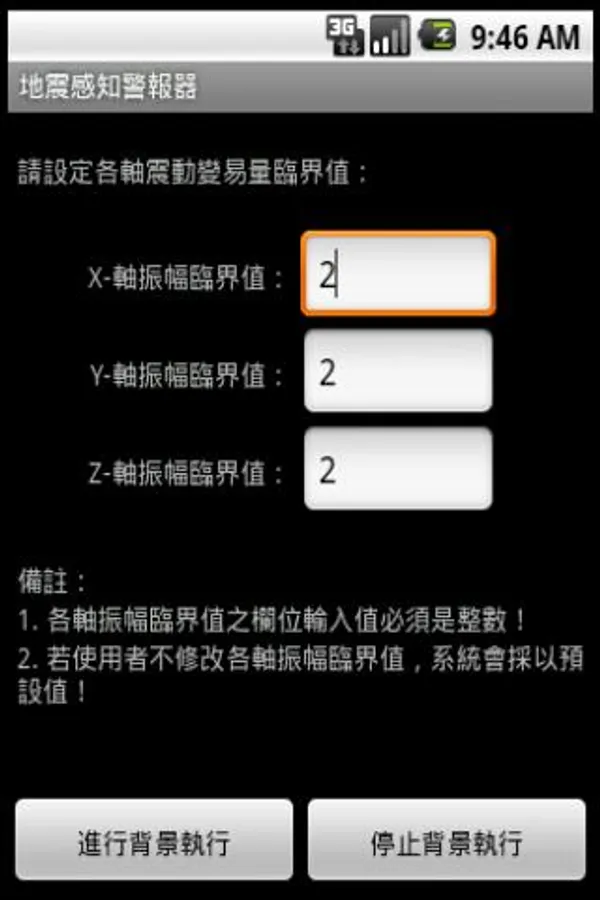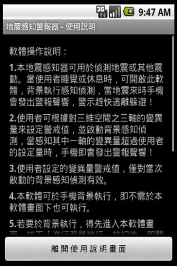 1. The alarm can be used to detect seismic sensing earthquakes or other shocks. When the user sleep or rest, you can turn this software, background execution perception detection, when the earthquake came the phone will sound an alarm, warning hurry to flee to escape!