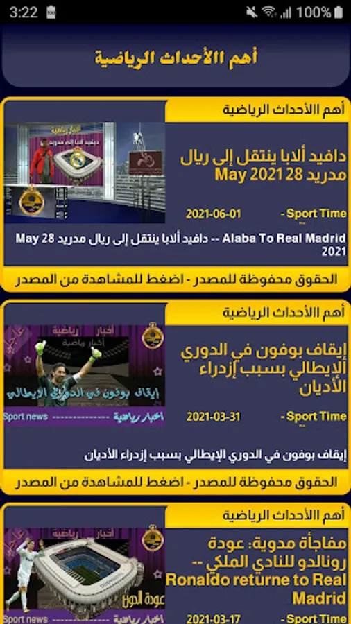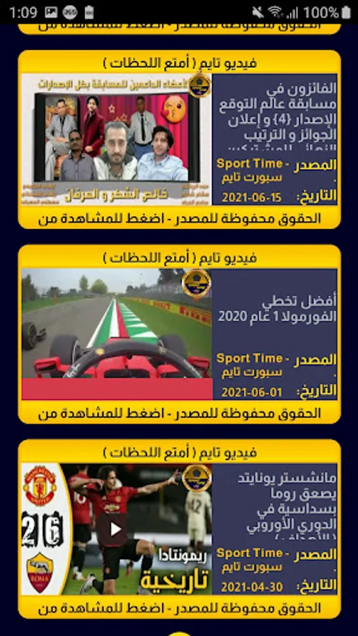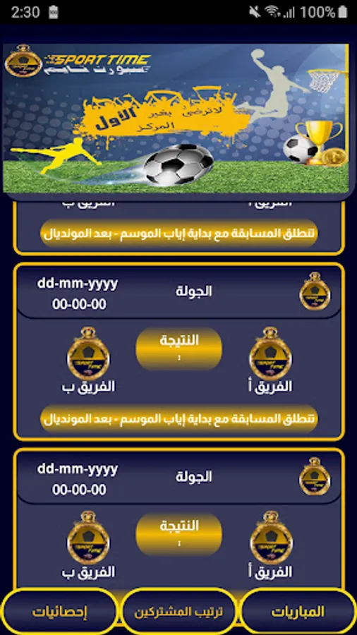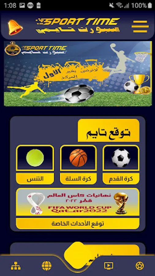 Sport Time: The first sports, competition and entertainment application, designed and prepared in beloved Yemen, to be a distinguished sports entertainment window for sports fans, in the Republic of Yemen and abroad through: