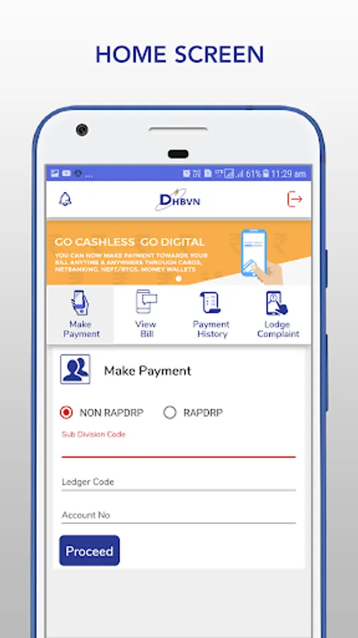 DHBVN Consumers can View Particulars of their Bill, Make Payment towards their Bill through Debit Cards, Credit Cards or Net Banking facility anywhere and anytime. Consumer can also View their Payment History and View their old Receipts as well. Consumers can also lodge complaints related to E-Payment Service through this Mobile Application.