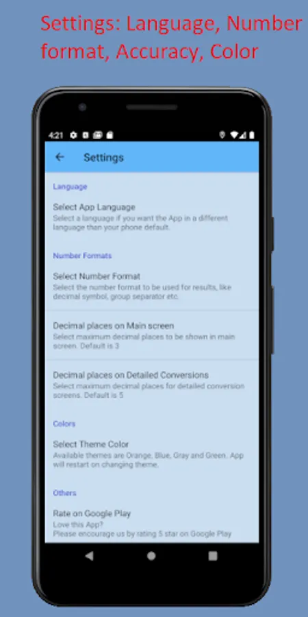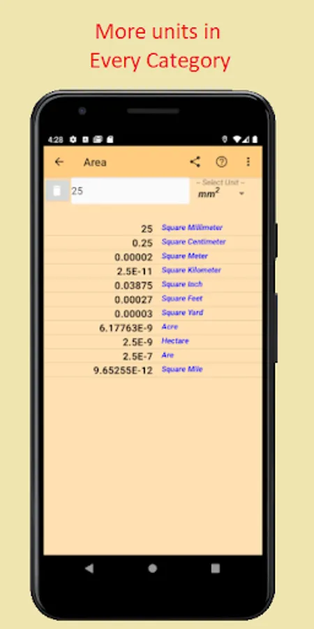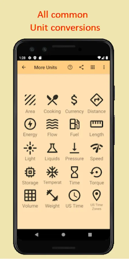 * Converts all commonly used units on 20+ categories (Area, Cooking, Distance, Energy, Flow, Fuel efficiency, Length, Light, Liquid volume, Pressure, Speed, Digital Storage, Temperature, Time, Torque, Volume, Weight)