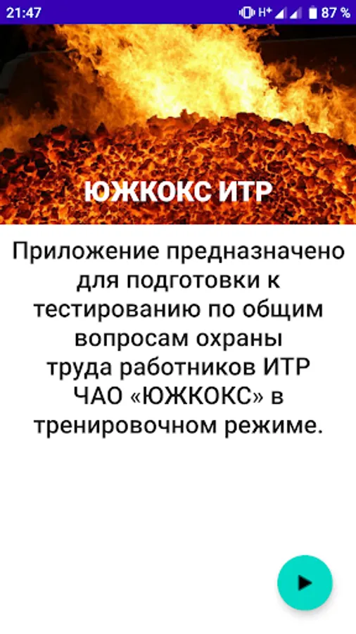 The application is intended for preparation for testing on general issues of labor protection of employees of engineering and technical personnel of PJSC "YUZHKOKS" in training mode.