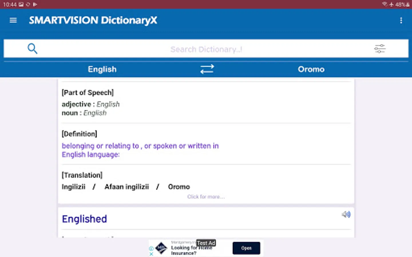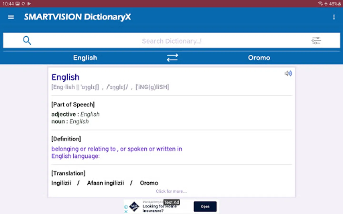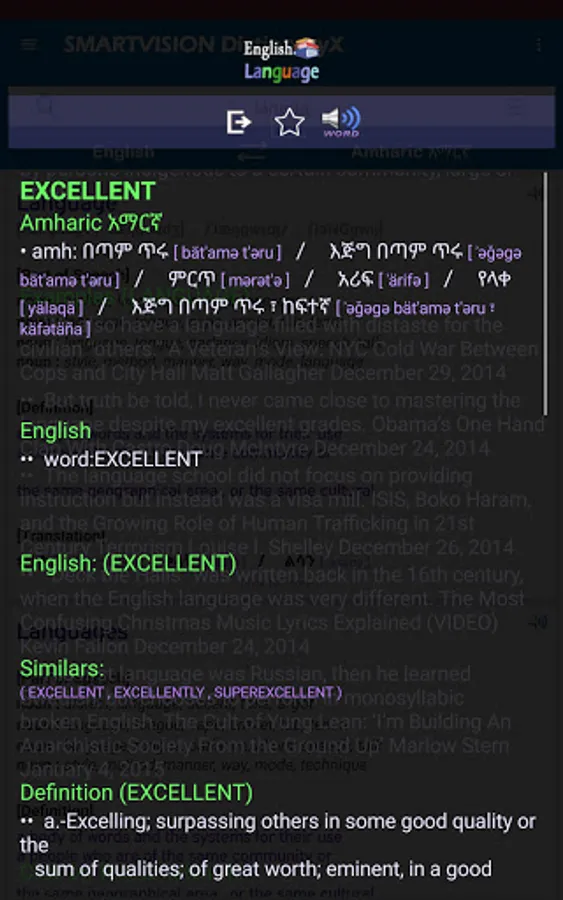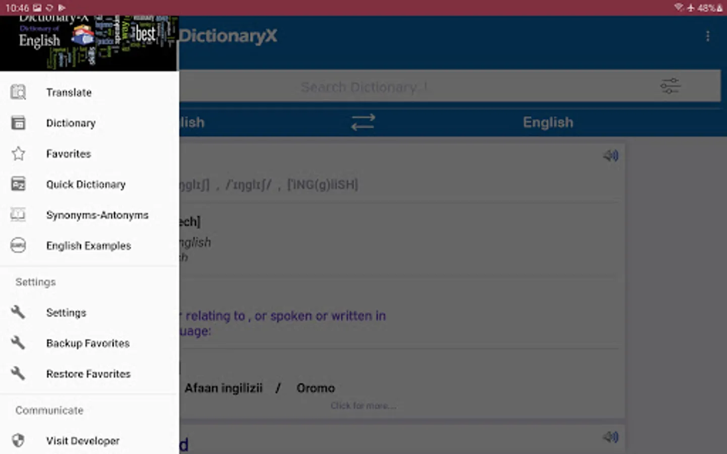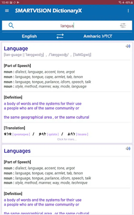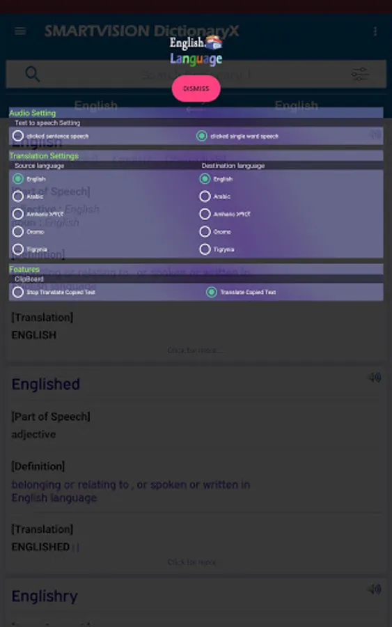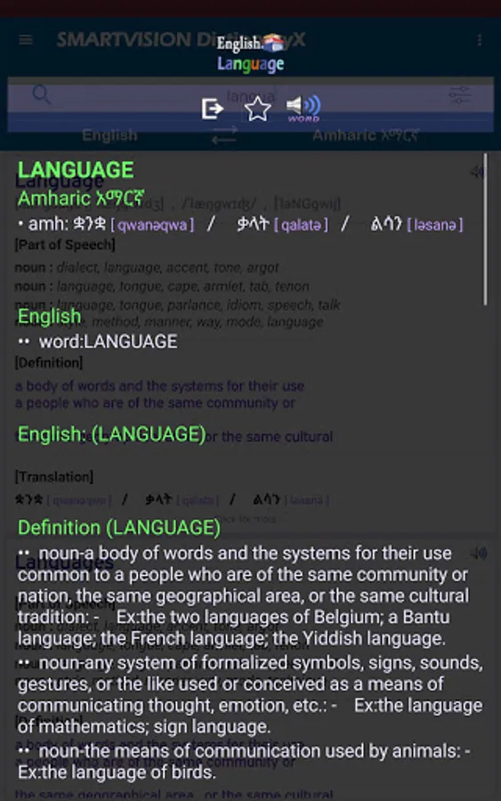 DictionaryX is now support translation to 5 different languages.(english , arabic , Amharic , Oromo , Tigrinyan ) Just click on any word in the app and you will get the all the linguistic info.