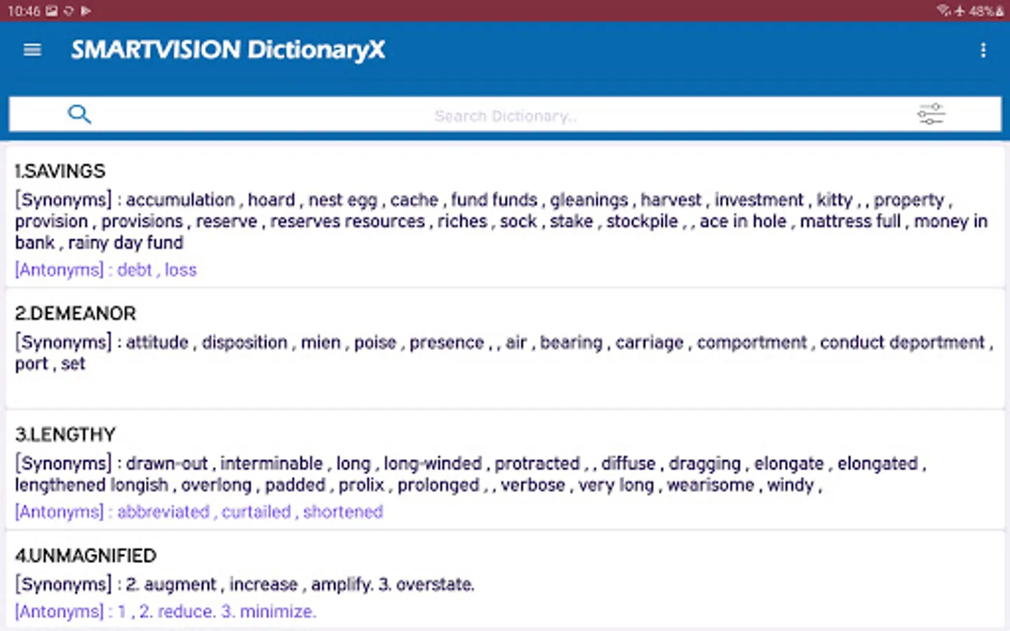 Complete offline english dictionary which contains more than 200 thousands words with its synonyms,antonyms,guidewords,examples and similarities.