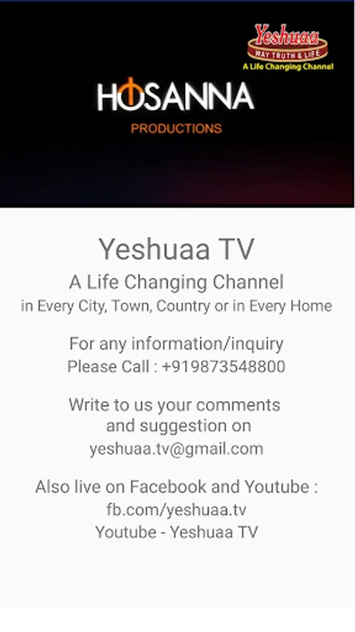 Yeshuaa TV (A Life Changing Channel) is India's first Hindi and Punjabi Masihi (Christian) HD Channel.