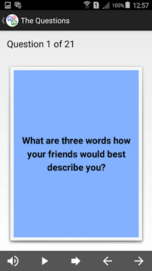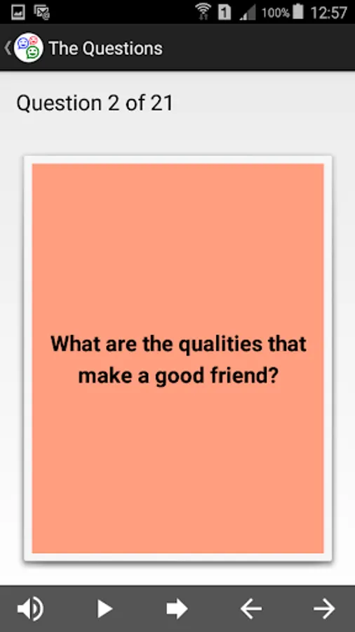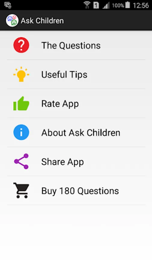 The app uses text to speech functionality of your mobile phone in order to read the questions so that even children who can’t read well can ask each other. On some mobile phones you are asked to download high quality text to speech voices.