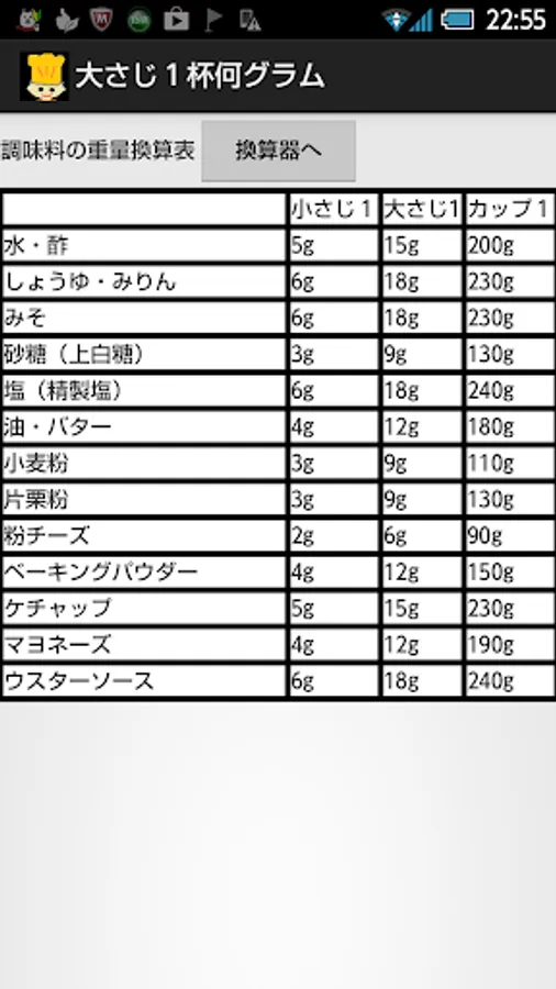 大さじ1杯、小さじ1杯、カップ1杯 などで記載されたものが何gになるかの換算表が表示されます。