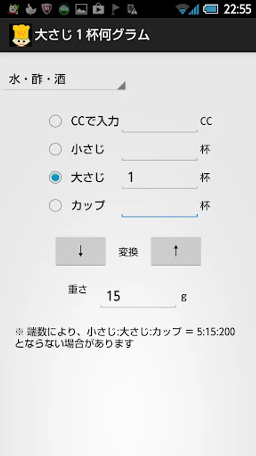 逆に、重さを入力し、大さじで何杯にあたるか、小さじで何杯にあたるかなども計算できます。
