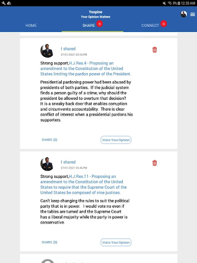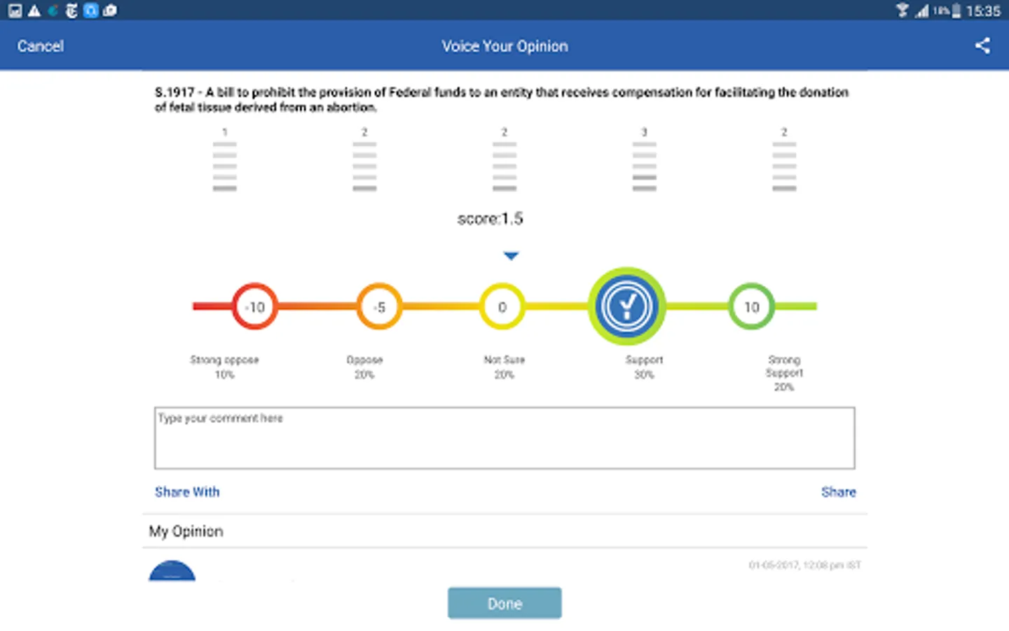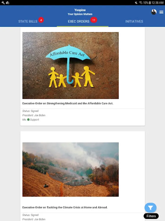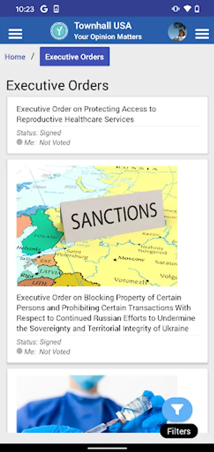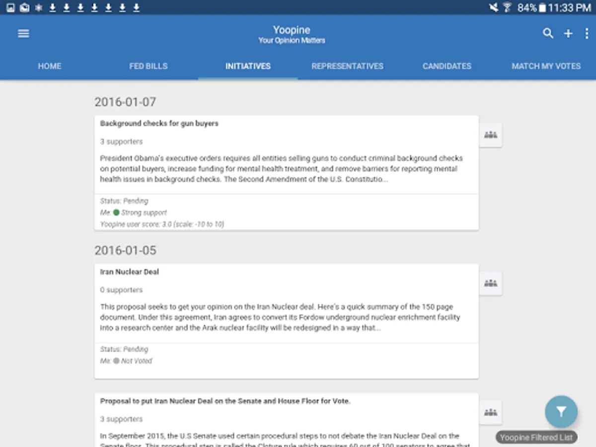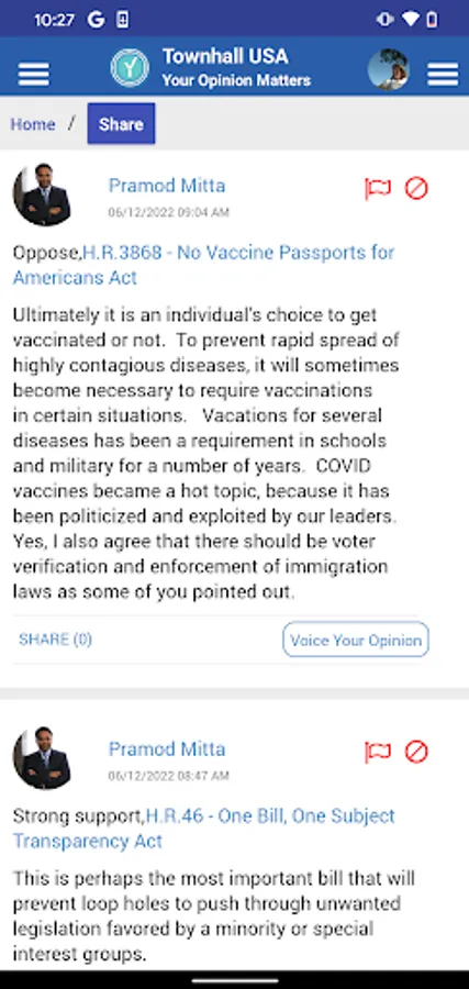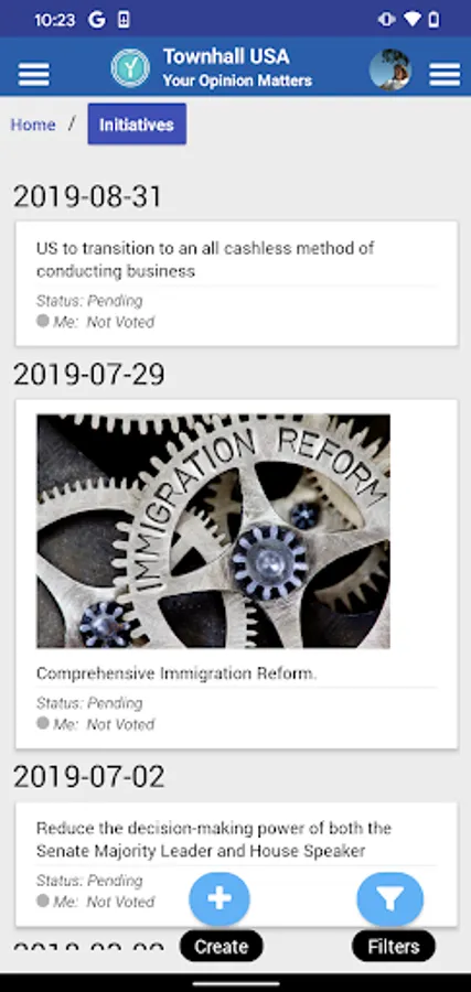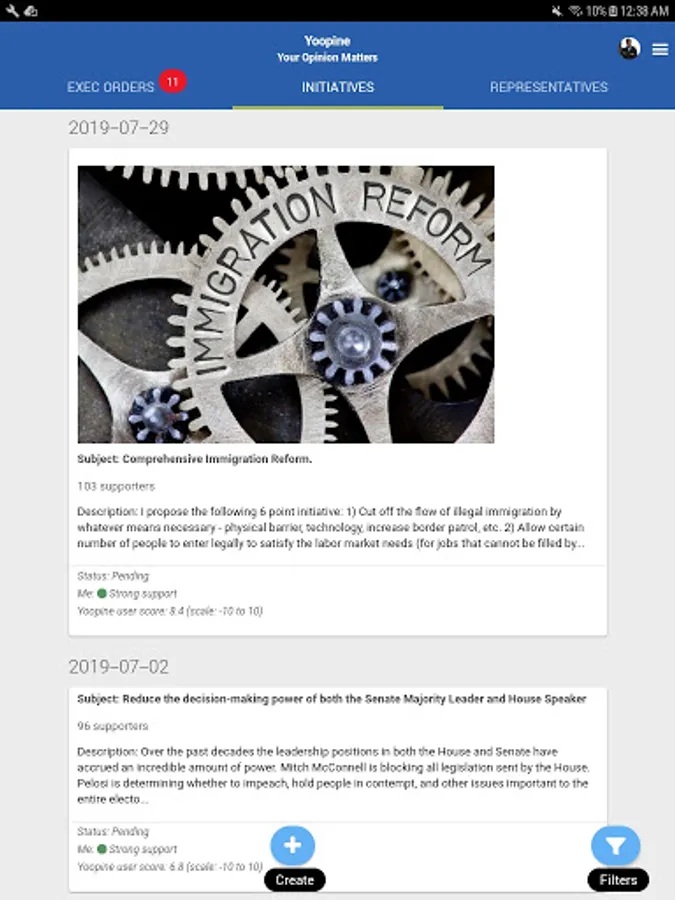 We aim to empower our members by aggregating individual user votes into a powerful voice that will get the attention of the political decision makers. Using the Townhall USA app or web site, we the people can tell our elected representatives whether we support or oppose the Legislative Bills introduced in Congress, Executive Orders issued by the President, and Initiatives created by the members. On the other side, our elected representatives can get a clear picture of how many members are supporting or opposing the issues by simply opening the app or website.