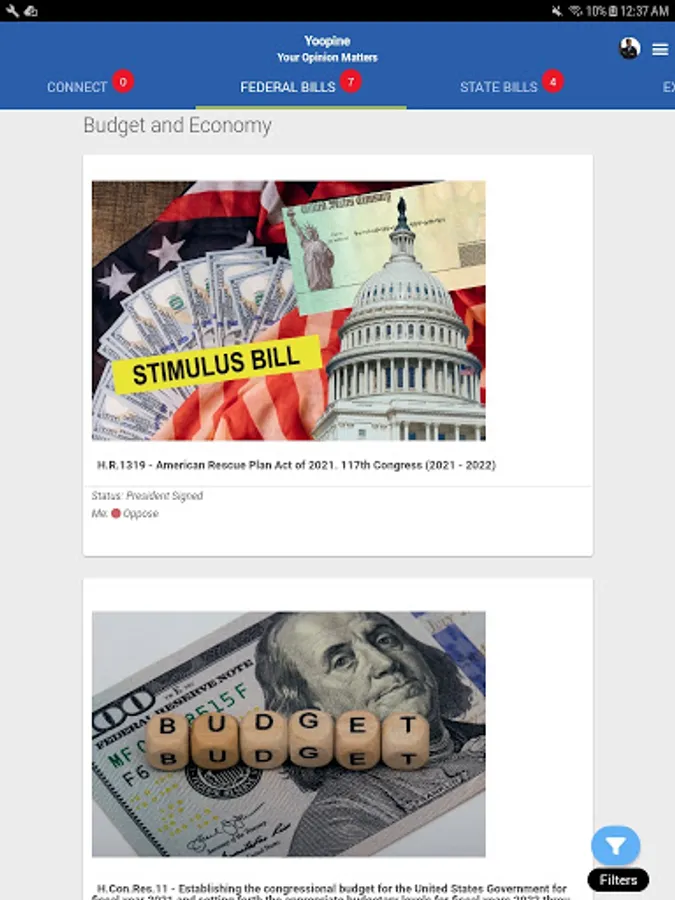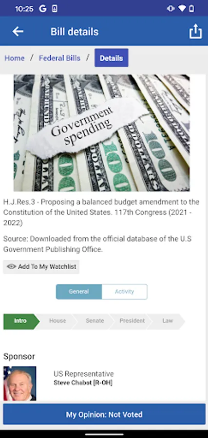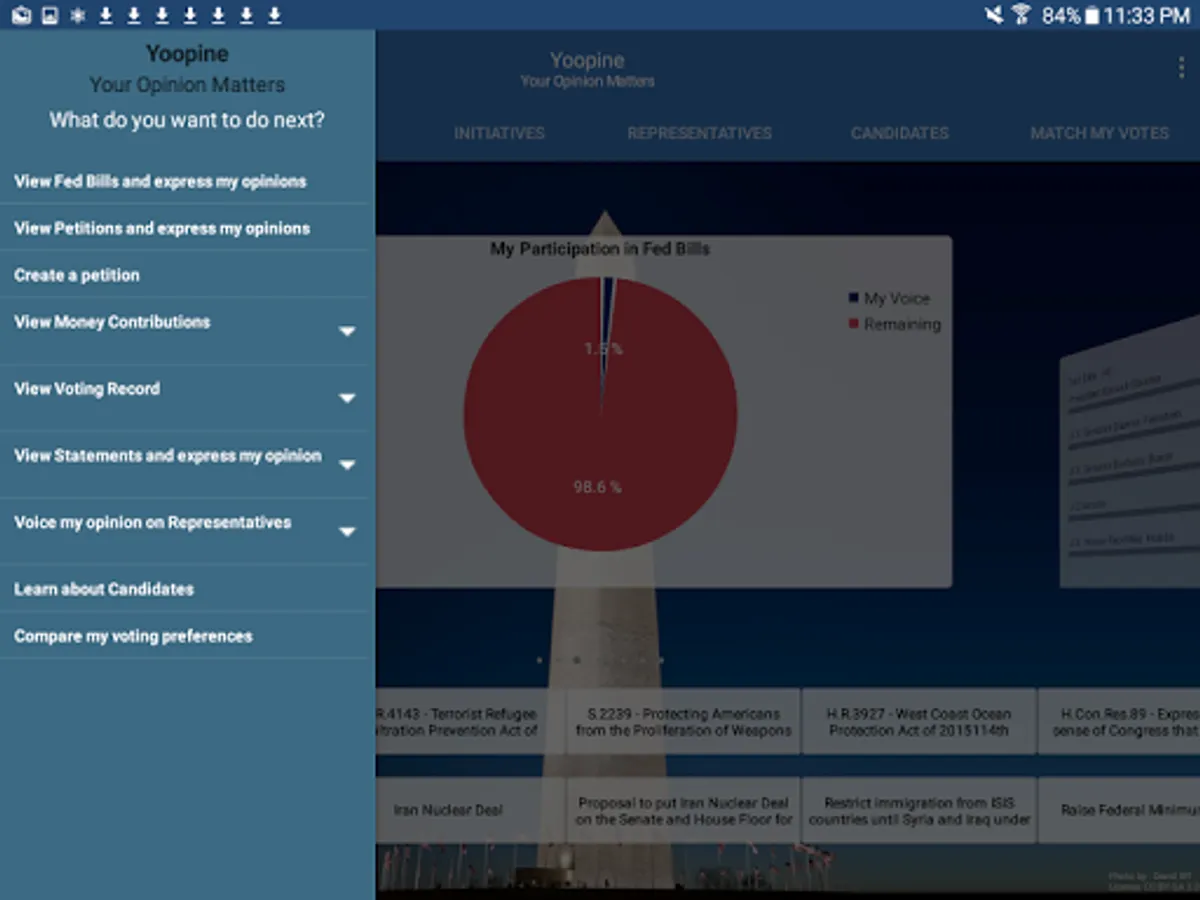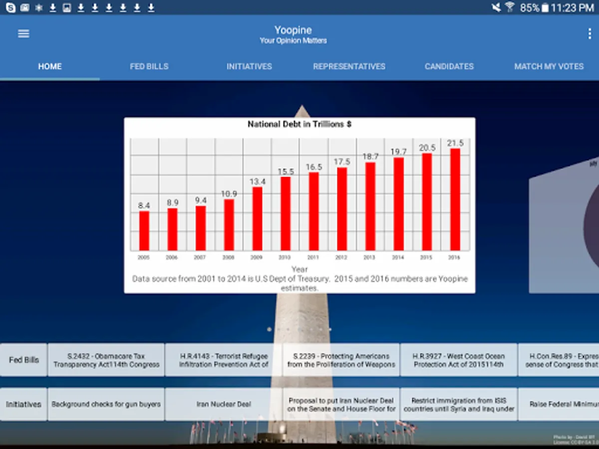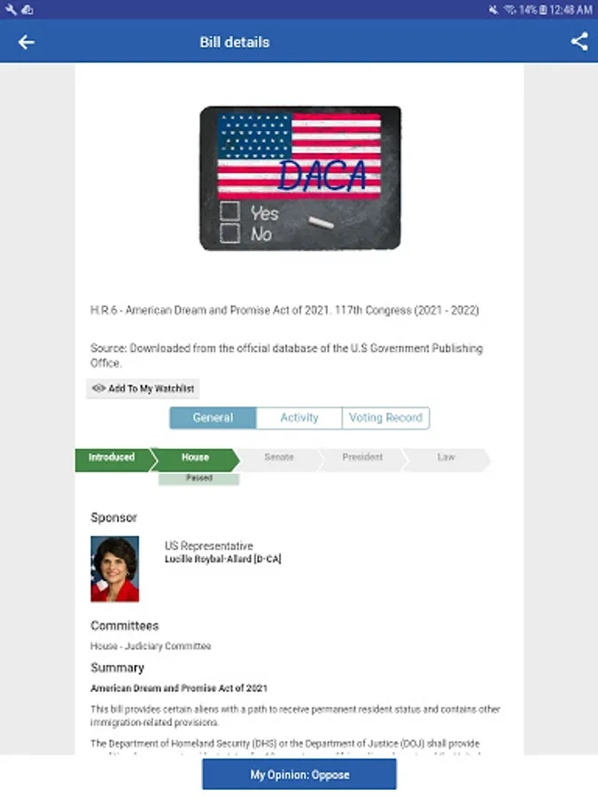 Note that content for Bills and Executives Orders comes from official government data sources. Please refer to Disclosures in the Settings menu to read more about content sources. Please update the app if you do not see Disclosures selection in the Settings menu.