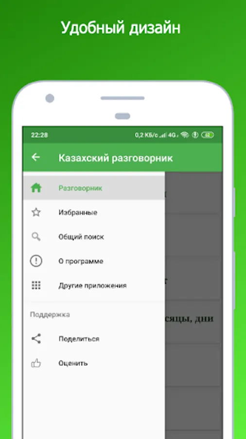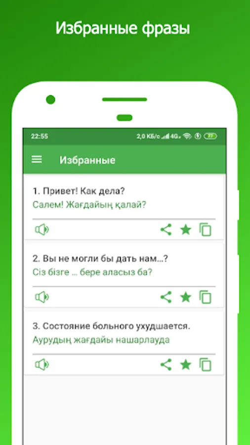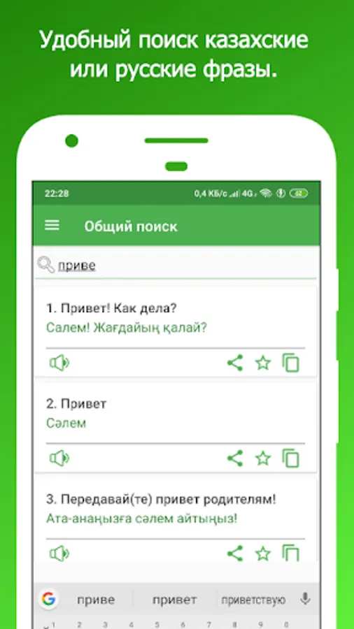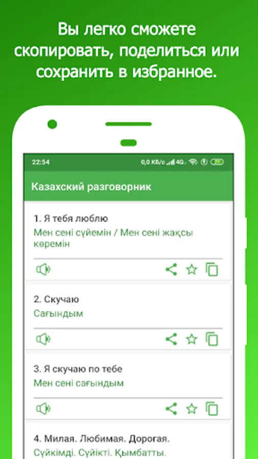 Удобный дизайн. Вы легко сможете скопировать фразы, поделиться или ж просто сохранить в избранное. Удобный поиск дает вам возможность поискать казахские или русские фразы. И самое главное приложение не требует интернет подключения.
