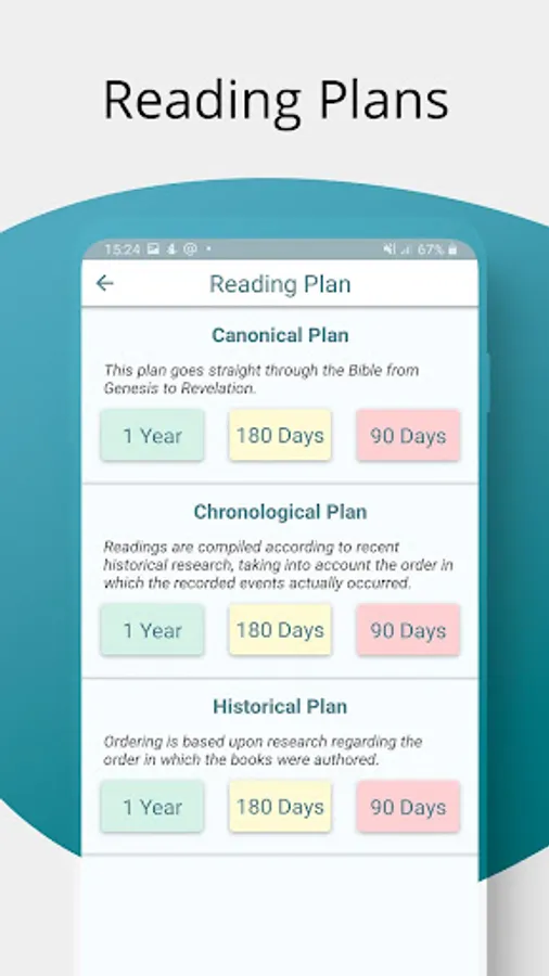 A useful feature that allows you to choose at what pace you want to read the numerous parts of the bible. 1 year, 180 days or 90 days are the options available to you. You may also choose to read the holy Bible in either Canonical, Chronological or Historical order.