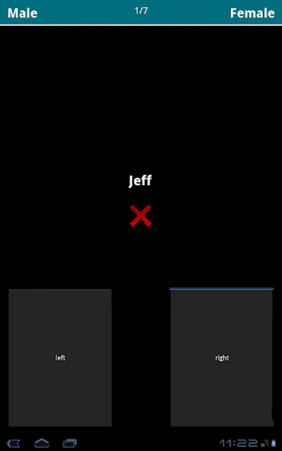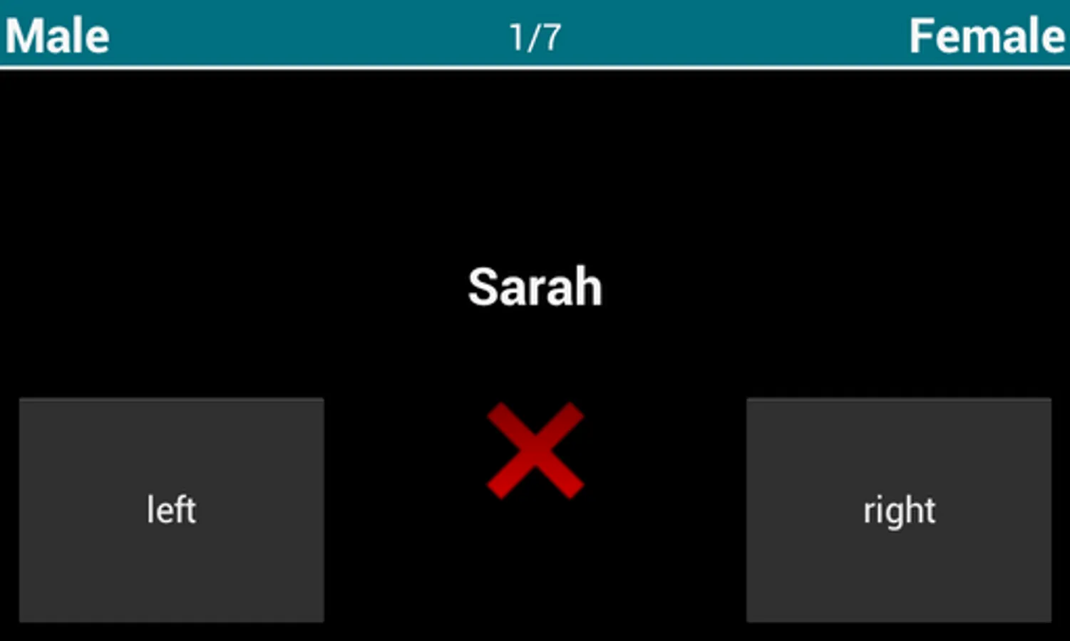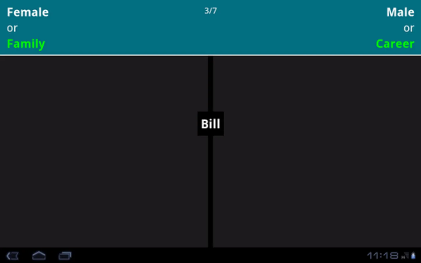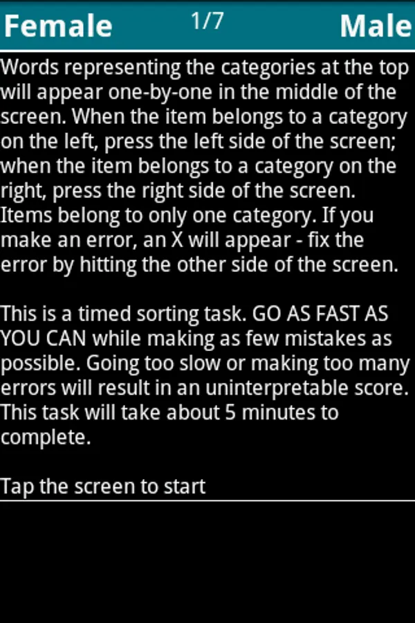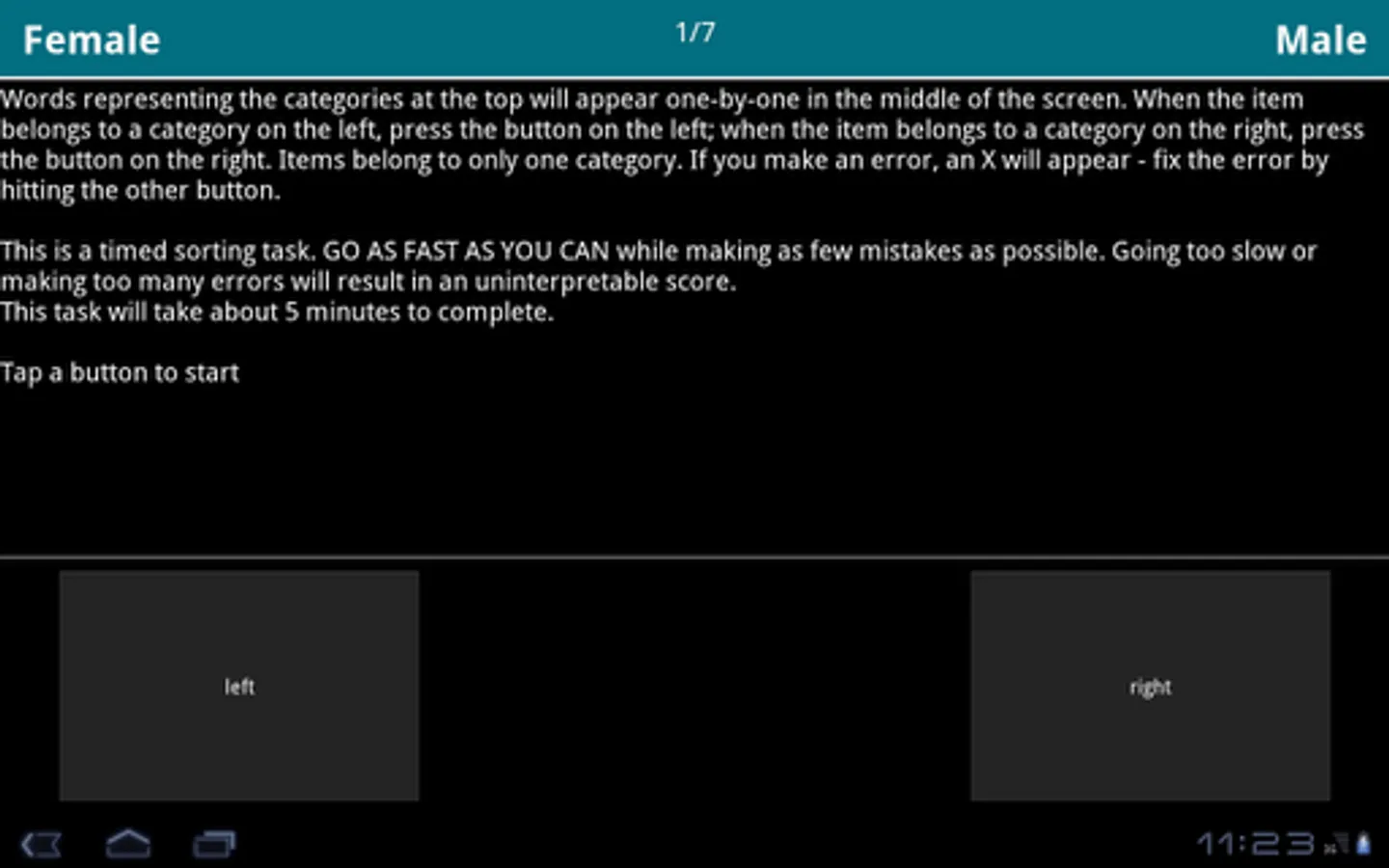 are presented a set of words to classify into groups, as quickly as possible, making as few mistakes as possible. The interaction with the screen can be done in 2 ways: through 2 virtual buttons at the bottom of the screen, or, in the second mode, the screen is split into 2 parts and you can interact by simply pressing the left side or right side of the screen (in the app are given detailed instructions on how to proceed). In the Settings menu, you can choose the mode of interaction and access to some research options.