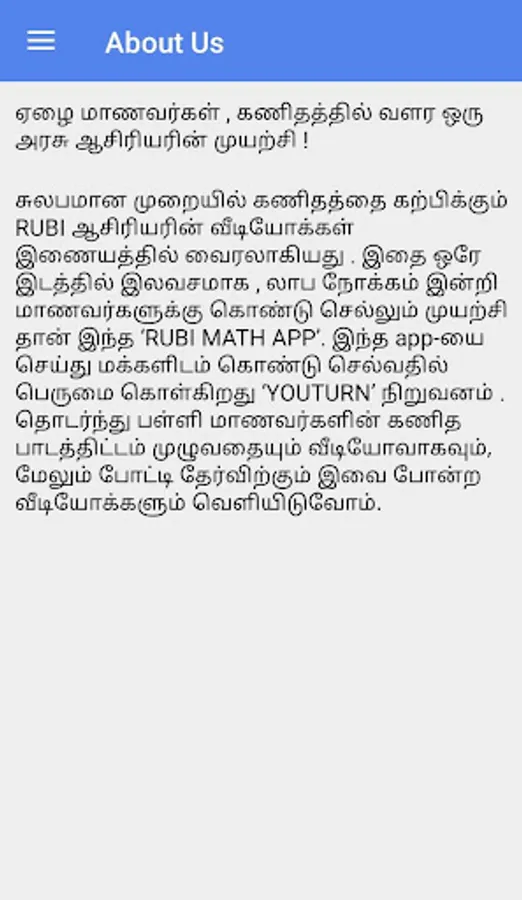 Learning mathematics in easy way by RUBI teacher was viral in Internet, and an attempt to have the videos available in single source and free attempt to bring it to students free of charge ‘RUBI MATH APP’ was emerged. The 'YOUTURN' company boasts of making this app and bringing to the public. We will continue to publish the entire school's math curriculum as video and also for competitive exams