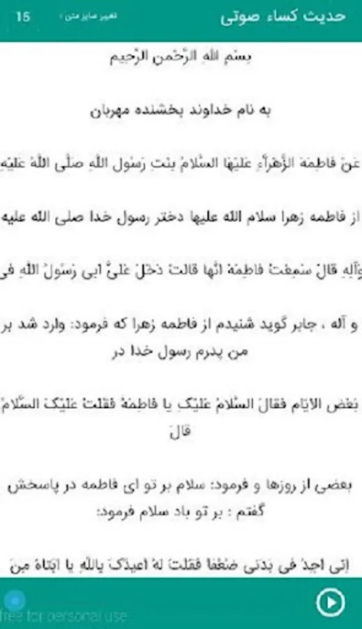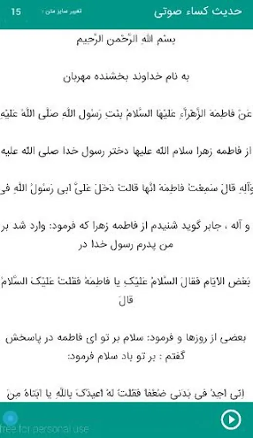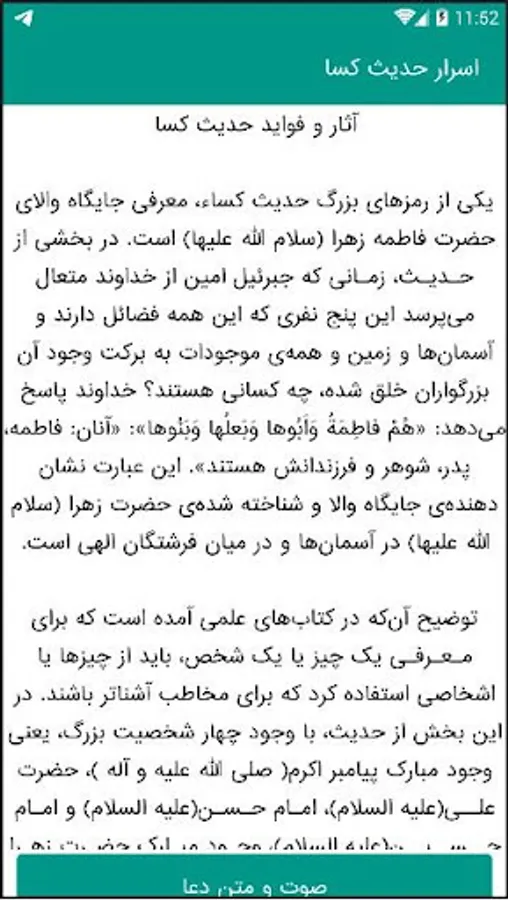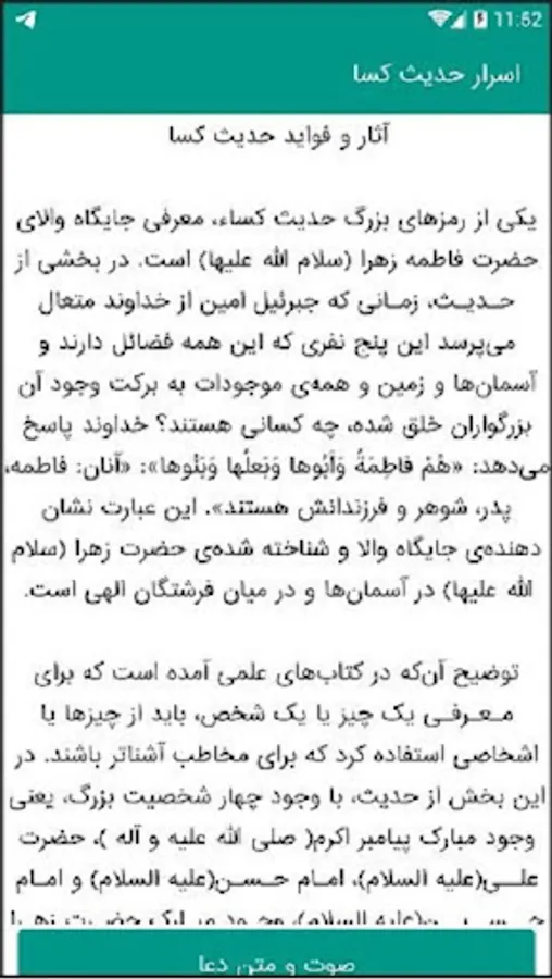 The hadith of Kesa is the narration of a story that took place in my house, Salma, and the infallible Imams used this hadith to prove their virtue. The Prophet (peace and blessings of Allaah be upon him) used to sit under a tent in my house after the revelation of the verse of purification, and then all five members of Al-'Abba came to serve the Prophet and sat under that tent.