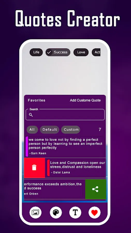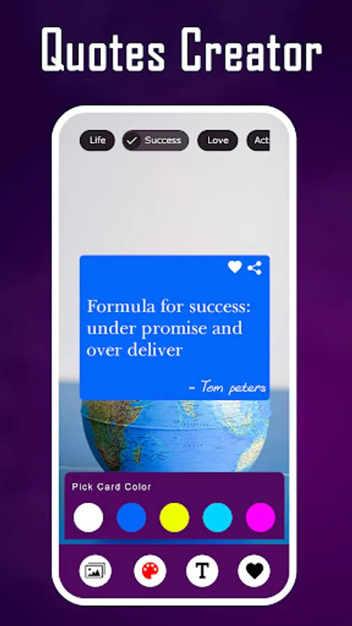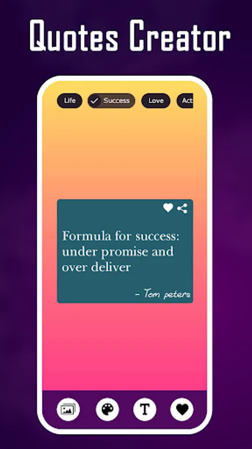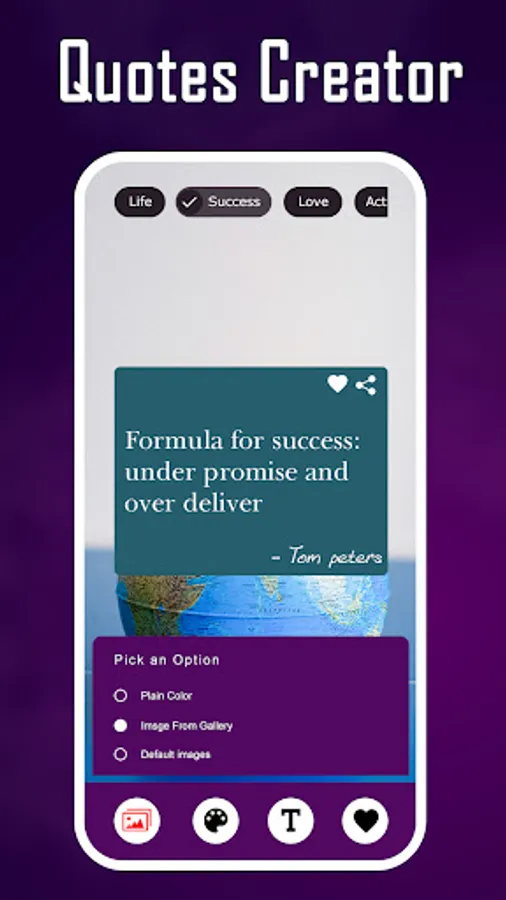 Quotes Creator is the best way to create and share your quotes with the world. Quotes Creator allows you to customize background, text colors, text size, and fonts, or you can choose your photo from your Gallery to be used as background, so you can share your own quotes with your friends.