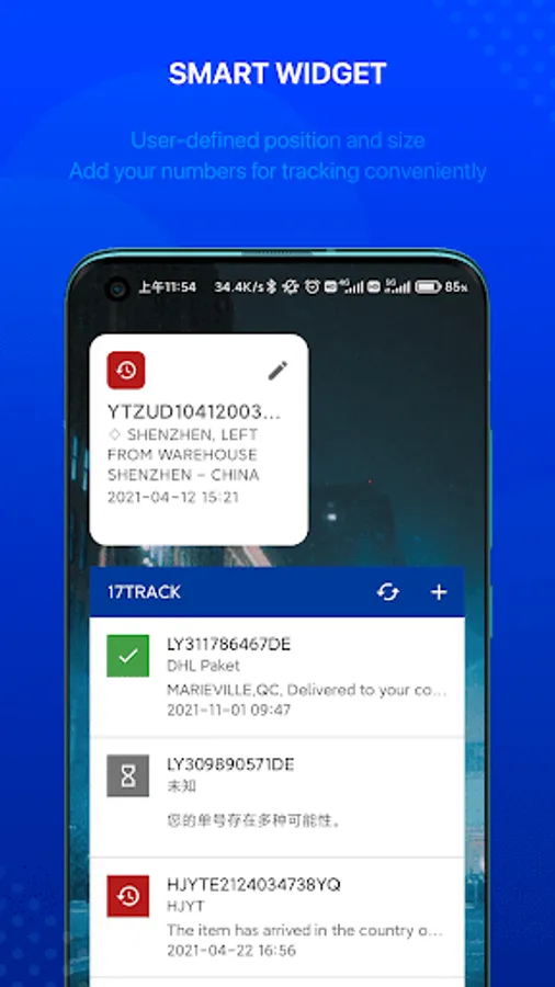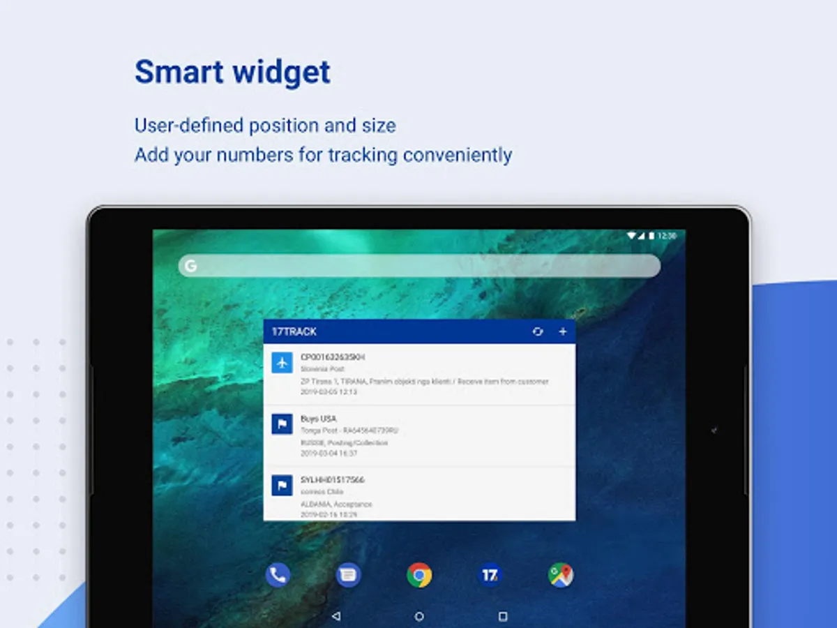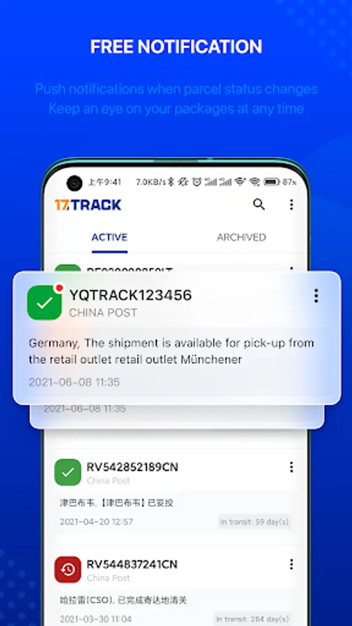 17TRACK Package Tracker is a global shopping package tracking platform,You can enjoy the happiness of parcel delivery. 17TRACK Package Tracker will enhance your complete shopping experience. This is the official app of 17TRACK.net. You can track packages from the POST,DHL, UPS, FedEx, USPS, DPD, GLS,Hermes, Royal Mail & other 1500+ carriers for free. 17TRACK Package Tracker supports over 1500 worldwide carriers,including: - Postal carriers: China post, China EMS, USPS, La poste, Correos Spain, etc.; - International express carriers: DHL, FedEx, UPS, TNT, Yodel, DPD ,Hermes, Toll, Aramex, SPSR, DPEX, SDA, GLS, etc. - China E-commerce carriers:Yanwen, One World, S.F. Express, YunExpress, DHL eCommerce, etc. For more carriers, they are coming up soon! 17TRACK Package Tracker Main Features: