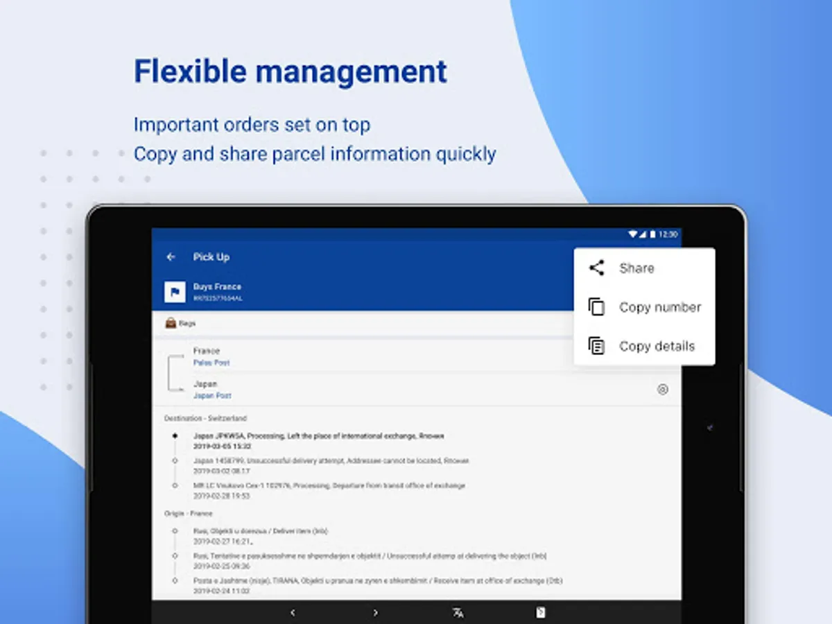 [Intelligent package tracking number management] Filterpackage numbers by updated date, package status, carrier, etc. Add or edit memo to your package tracking numbers Add categories to your package tracking numbers Copy and share package tracking links & results easily