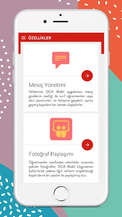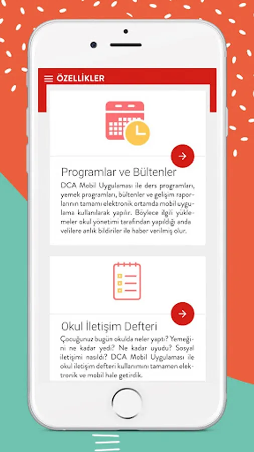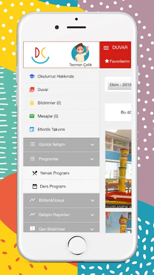 Parents can communicate with class teachers or school administrators with the DCA Mobile application, follow the photos taken by the teachers during the activities, attendance status, course schedules, cooking schedules, newsletters and development reports can be reached with our mobile application in electronic environment.