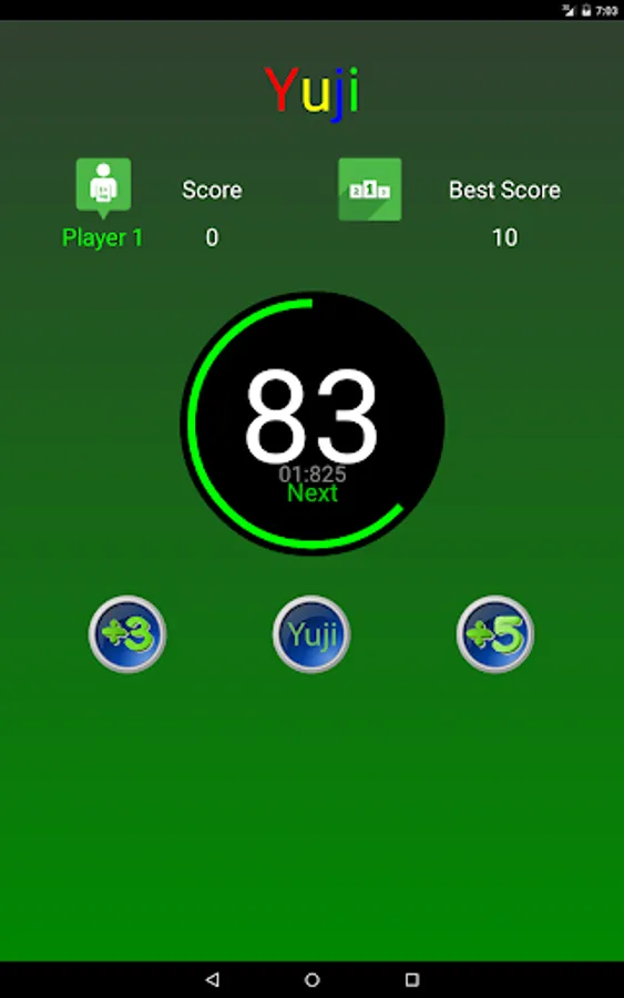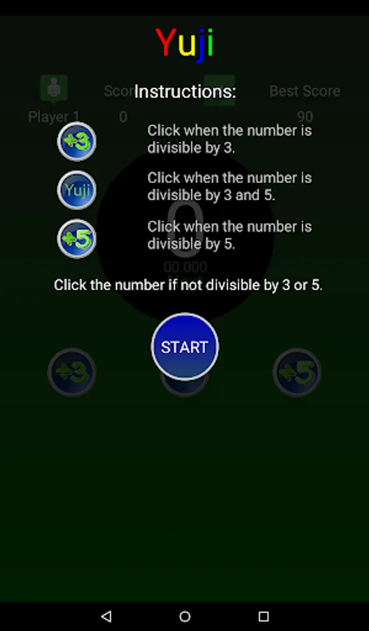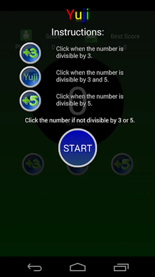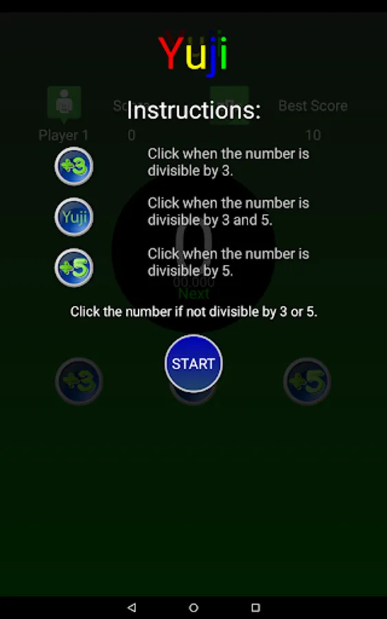 Yuji is a brain training game whose purpose is to challenges the speed of your brain by clicking the correct button taking into account if a proposed number is divisible by 3, 5, both or none.