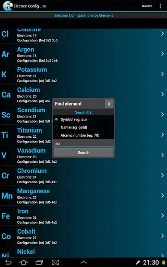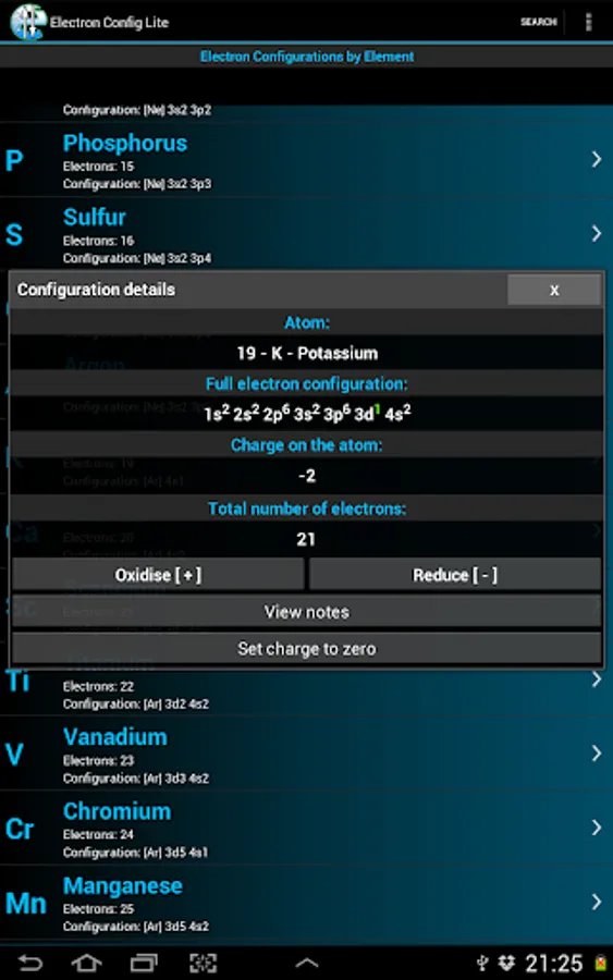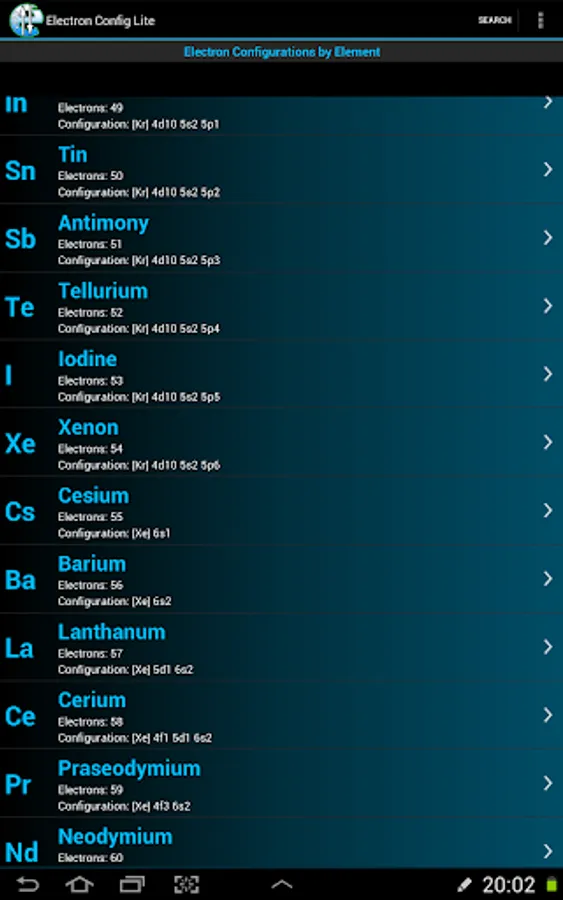Electron Config Lite is a free version of our EC Pro app. It is an electron configurations tool designed to predict electron configuration of all elements in the periodic table. It was designed with the student in mind, but can be a useful reference for a professional scientist. However, be sure to check out the Pro version as it has no limitations that are found in this free one.